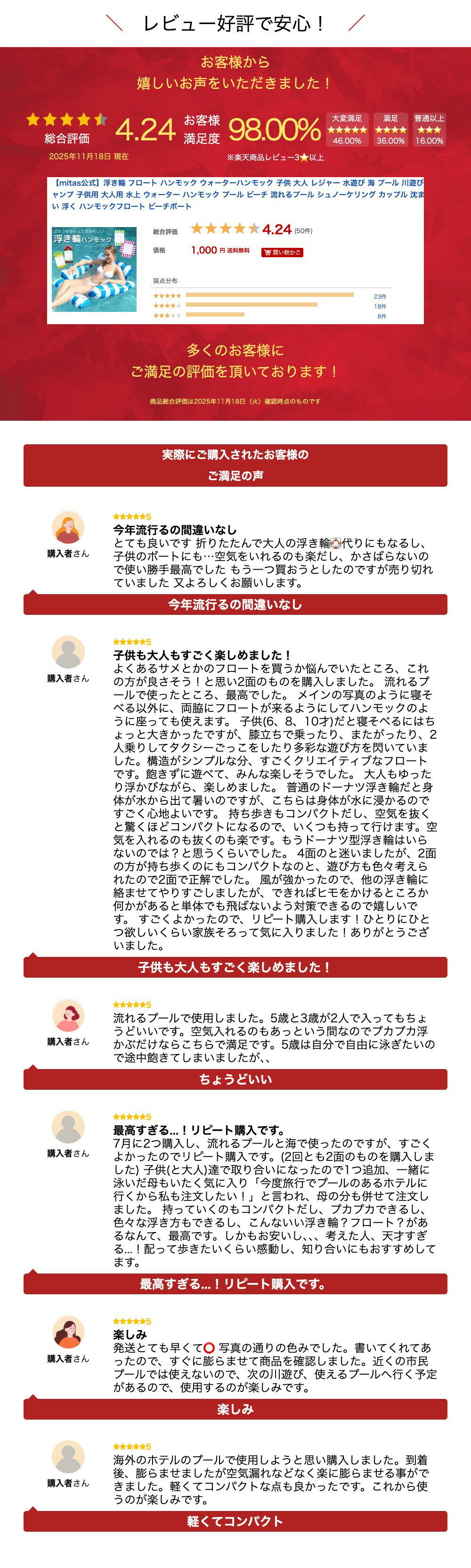 ■備考 ウォーターハンモック/浮き輪/子供/大人/フロート/ハンモック/120×70CM/浮き具/大きい/水上ベッド/水上ハンモック/沈まない/浮く/ハンモックフロート/レジャー/水遊び/海/プール/川遊び/キャンプ/子供用/大人用/水上/ウォーター/ハンモック/背もたれ//プール/ビーチ/ソファー/ビーチボート/エアベッド/流れるプール/シュノーケリング/カップル/可愛い/グリーン/ブルー/ショッキングピンク/イエロー・リゾート気分を楽しめるウォーターハンモック 水の上でゆったりとくつろげる「ウォーターハンモック」は、プールや海、川遊びなどのレジャーシーンで大活躍。120×70cmの大きめサイズで、大人も子供もゆったり横になれる浮き具です。浮き輪のような感覚で使用できるこのハンモックフロートは、背もたれ付きで快適なリラックス空間を演出。海や流れるプール、ビーチ、キャンプでも注目のアイテムです。 ・大人も子供も楽しめる!安心のサイズ設計 約120×70cmの広々サイズで、大人用としても子供用としても使用可能。体を包み込むようなソファーのような構造で、水上でも沈まない安定感が特長です。浮き輪のように丸まることなく、身体をやさしく支える構造で快適な水遊びをサポートします。プール・海・川遊びなど、さまざまなシーンで活躍する万能なフロートです。 ・浮き輪以上の快適さ!水上ベッドとしても使える このウォーターハンモックは、ただの浮き輪ではなく、水上ベッドやエアベッドとして使えるクッション性の高さが魅力。浮く構造と通気性のあるメッシュ素材で、水の冷たさを感じながらも体は浮かび、まるでハンモックに包まれているような心地よさ。海水浴やビーチボートでのんびり過ごしたいときにもぴったりです。 ・簡単に使えて持ち運びもラクラク 空気を入れるだけで簡単に使える設計で、使わないときは空気を抜けばコンパクトに収納可能。軽量なので荷物が多いキャンプや海水浴でも持ち運びラクラクです。グリーン・ブルー・ショッキングピンク・イエローなど、可愛いカラー展開でカップルや友人同士で色違いにして楽しむのもおすすめ。 ・家族みんなで楽しめるレジャーアイテム 子供と一緒に遊べるウォーターハンモックは、川遊びや流れるプール、シュノーケリングの休憩にも最適。おしゃれで可愛いだけでなく、安全性にも配慮された構造で、沈まない安定感とフィット感が水の上でも安心を提供します。家族旅行や夏のアウトドアレジャーに、1つ持っておくと重宝すること間違いなしのアイテムです。 [注意事項] ※商品ご使用時の破損や事故などについては責任を負いかねます。 ※輸入品の為、輸送の際にキズ・汚れ・箱潰れが生じている場合がございますが商品は新品ですのでご安心ください。 ※サイズ・重量等は多少の誤差が生じる場合がございますがご了承ください。 ※商品の画像はお客様がご覧になっているモニター・画面環境・照明などの関係上、実際の色味と多少異なる場合がございます。 ※入荷時期によって若干色味やデザイン等が異なる場合もございますのでご了承ください。 ※万が一、製造上の原因による品質不良の場合は同等品との交換となりますので、それ以外の責はご容赦下さい。