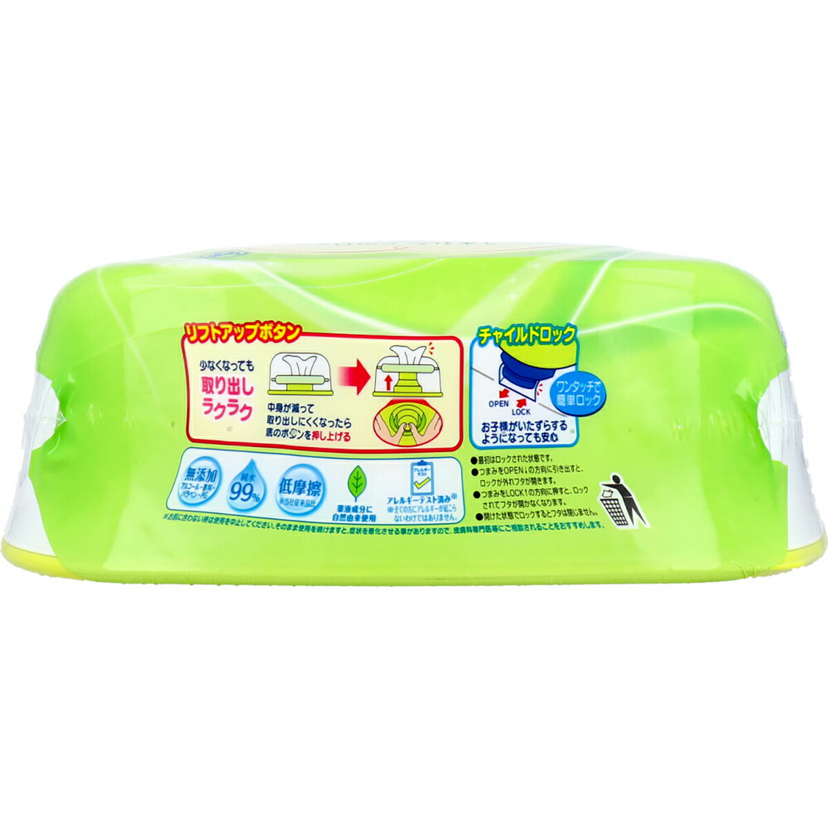 【成分】水、乳酸、グリセリン、安息香酸Na、メロキサポール252、セトリモニウムクロリド、ポリアミノプロピルビグアニド、EDTA-2Na、ベンザルコニウムクロリド【基布素材】パルプ、ポリエステル、レーヨン、ポリオレフィン【寸法】140×200【使用方法】・手や容器を清潔にしてからつめかえてください。・初めてお使いになる時は、容器の底ブタをはずし、中の袋のシールをはがして容器に入れてください。ロックを解除してフタを開け、ティッシュを取り出してください。・つめかえの時は、リフトアップボタンを元の位置に戻してからつめかえてください。【注意】・傷やはれもの、湿疹等のある部分には使用しないでください。・お肌に異常が生じていないかよく注意して使用してください。お肌に合わないとき(使用中、赤み、はれ、かゆみ等の異常があらわれた場合)は、ご使用をおやめください。そのまま使用を続けますと症状を悪化させることがありますので、医師にご相談ください。・このティッシュはトイレには流さないでください。・中身の乾燥を防ぐためフタをしっかり閉めて保管してください。・直射日光や高温になる場所は避けて保管してください。・乳幼児の手の届かないところに保管してください。・つめかえの時は、きれいな手でつめかえてください。・温めるとティッシュが変色する場合があります。変色したティッシュを取り除いて、ご使用ください。【成分】水、乳酸、グリセリン、安息香酸Na、メロキサポール252、セトリモニウムクロリド、ポリアミノプロピルビグアニド、EDTA-2Na、ベンザルコニウムクロリド【基布素材】パルプ、ポリエステル、レーヨン、ポリオレフィン【寸法】140×200【使用方法】・手や容器を清潔にしてからつめかえてください。・初めてお使いになる時は、容器の底ブタをはずし、中の袋のシールをはがして容器に入れてください。ロックを解除してフタを開け、ティッシュを取り出してください。・つめかえの時は、リフトアップボタンを元の位置に戻してからつめかえてください。【注意】・傷やはれもの、湿疹等のある部分には使用しないでください。・お肌に異常が生じていないかよく注意して使用してください。お肌に合わないとき(使用中、赤み、はれ、かゆみ等の異常があらわれた場合)は、ご使用をおやめください。そのまま使用を続けますと症状を悪化させることがありますので、医師にご相談ください。・このティッシュはトイレには流さないでください。・中身の乾燥を防ぐためフタをしっかり閉めて保管してください。・直射日光や高温になる場所は避けて保管してください。・乳幼児の手の届かないところに保管してください。・つめかえの時は、きれいな手でつめかえてください。・温めるとティッシュが変色する場合があります。変色したティッシュを取り除いて、ご使用ください。