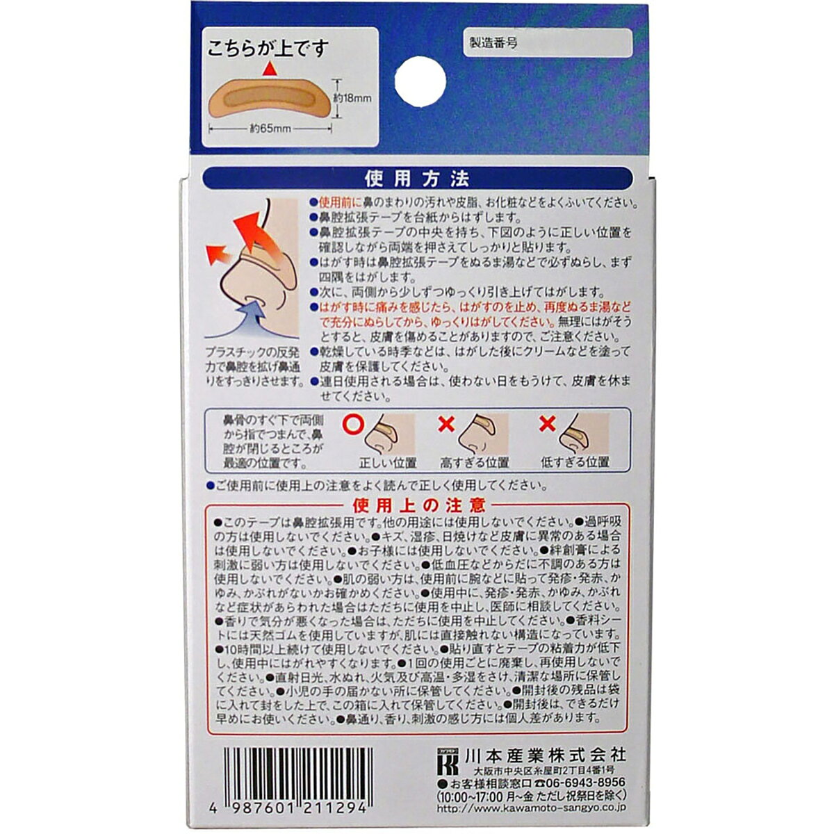 鼻がつまる時に! 就寝時に! スポーツに!プラスチックの反発力で鼻腔を拡げて、鼻通りスッキリ!!【材質】基布:ポリエステル不織布、ウレタンラミネートバー:PET粘着剤:アクリル系香りシート:綿布、香料、天然ゴム 他【使用方法】・使用前に鼻のまわりの汚れや皮脂、お化粧などをよくふいてください。・鼻腔拡張テープを台紙からはずします。・鼻腔拡張テープの中央を持ち、正しい位置を確認しながら両端を押さえてしっかりと貼ります。・はがす時は鼻腔拡張テープをぬるま湯などで必ずぬらし、まず四隅をはがします。・次に、両側から少しずつゆっくり引き上げてはがします。・はがす時に痛みを感じたら、はがすのを止め、再度ぬるま湯などで充分にぬらしてから、ゆっくりはがしてください。無理にはがそうとすると、皮膚を傷めることがありますので、ご注意ください。・乾燥している時季などは、はがした後にクリームなどを塗って皮膚を保護してください。・連日使用される場合は、使わない日をもうけて、皮膚を休ませてください。【使用上の注意】・このテープは鼻腔拡張用です。他の用途には使用しないでください。・過呼吸の方は使用しないでください。・キズ、湿疹、日焼けなど皮膚に異常のある場合は使用しないでください。・お子様には使用しないでください。・絆創膏による刺激に弱い方は使用しないでください。・妊娠している方、またその可能性のある方は使用しないでください。・低血圧などからだに不調のある方は使用しないでください。・肌の弱い方は、使用前に腕などに貼って発疹・発赤、かゆみ、かぶれがないかお確かめください。・使用中に、発赤・発疹、かゆみ、かぶれなど症状があらわれた場合はただちに使用を中止し、医師に相談してください。・香りで気分が悪くなった場合は、ただちに使用を中止してください。・香料シートには天然ゴムを使用していますが、肌には直接触れない構造になっています。・10時間以上続けて使用しないでください。・貼り直すとテープの粘着力が低下し、使用中にはがれやすくなります。・1回の使用ごとに廃棄し、再使用しないでください。・直射日光、水ぬれ、火気及び高温・多湿をさけ、清潔な場所に保管してください。・小児の手の届かない所に保管してください。鼻がつまる時に! 就寝時に! スポーツに!プラスチックの反発力で鼻腔を拡げて、鼻通りスッキリ!!【材質】基布:ポリエステル不織布、ウレタンラミネートバー:PET粘着剤:アクリル系香りシート:綿布、香料、天然ゴム 他【使用方法】・使用前に鼻のまわりの汚れや皮脂、お化粧などをよくふいてください。・鼻腔拡張テープを台紙からはずします。・鼻腔拡張テープの中央を持ち、正しい位置を確認しながら両端を押さえてしっかりと貼ります。・はがす時は鼻腔拡張テープをぬるま湯などで必ずぬらし、まず四隅をはがします。・次に、両側から少しずつゆっくり引き上げてはがします。・はがす時に痛みを感じたら、はがすのを止め、再度ぬるま湯などで充分にぬらしてから、ゆっくりはがしてください。無理にはがそうとすると、皮膚を傷めることがありますので、ご注意ください。・乾燥している時季などは、はがした後にクリームなどを塗って皮膚を保護してください。・連日使用される場合は、使わない日をもうけて、皮膚を休ませてください。【使用上の注意】・このテープは鼻腔拡張用です。他の用途には使用しないでください。・過呼吸の方は使用しないでください。・キズ、湿疹、日焼けなど皮膚に異常のある場合は使用しないでください。・お子様には使用しないでください。・絆創膏による刺激に弱い方は使用しないでください。・妊娠している方、またその可能性のある方は使用しないでください。・低血圧などからだに不調のある方は使用しないでください。・肌の弱い方は、使用前に腕などに貼って発疹・発赤、かゆみ、かぶれがないかお確かめください。・使用中に、発赤・発疹、かゆみ、かぶれなど症状があらわれた場合はただちに使用を中止し、医師に相談してください。・香りで気分が悪くなった場合は、ただちに使用を中止してください。・香料シートには天然ゴムを使用していますが、肌には直接触れない構造になっています。・10時間以上続けて使用しないでください。・貼り直すとテープの粘着力が低下し、使用中にはがれやすくなります。・1回の使用ごとに廃棄し、再使用しないでください。・直射日光、水ぬれ、火気及び高温・多湿をさけ、清潔な場所に保管してください。・小児の手の届かない所に保管してください。