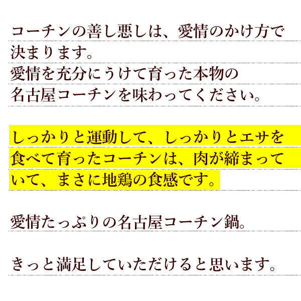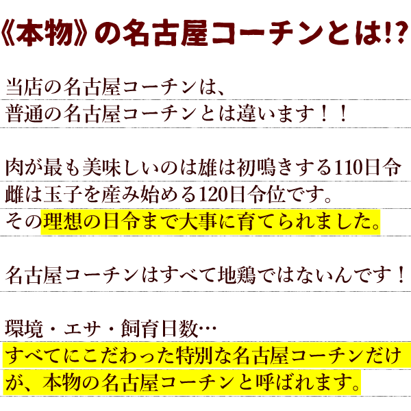 商品内容名古屋コーチンのローストチキンレッグ 骨付き もも焼き1本入り 約160g>>>ローストチキンのタレの追加はコチラから※ローストチキンのタレは【醤油ダレ】です商品形態冷凍限定発送いたします。>>>配送温度についての注意事項<<< ※冷蔵限定商品と同梱の場合は別途送料がかかります。※当店からの確認メールで配送温度をご確認下さい。お届け日発送からお届けまでの日数はコチラからご確認いただけます。⇒ お届け日数表 追加注文OK!同梱すれば送料無料!オトクです!召し上がり方【ローストチキンの美味しいレシピ】沸騰したお湯に5分間いれてください。温まったら、たれをかけておめしあがりください。賞味期限 冷凍60日以上 到着後、なるべくお早めにお召し上がりください。原材料鶏肉(愛知県産)、たまりしょうゆ(小麦を含む)、発酵調味料、果糖ぶどう糖液糖、たん白加水分解物、醸造酢、食塩、水飴、チキンエキス、香辛料/着色料(カラメル色素)、酒精、調味料(アミノ酸)ギフト・お中元・お歳暮・父の日・母の日・敬老の日・クリスマスギフトなどにどうぞ。 お支払い方法は? 送料はいくら? 荷物の包装は? 日時指定はできるの?名古屋コーチンの特長は何と言ってもその肉質。赤身を帯びた肉はよく締まっていて弾力があり、噛みしめるごとにあふれ出す「こく」のある味わいは昔ながらの鶏肉の旨みがぎゅ〜っと凝縮されています。水郷どりの柔らかい食感と甘みのある味わいに対し、名古屋コーチンはしっとり密度が高い肉質で重量感があり、独特の香りと野趣あふれる風味が特長です。今回はこの名古屋コーチンの旨みをさらに楽しめるようにレッグ(脚)を1本1本丁寧にローストしました。丁寧に焼きあげることで、ガチガチに硬くならず、よりぎゅ〜っと締まったしっとり食感になって名古屋コーチンならではの美味しさがお口いっぱいに広がります。この美味しさはまさに大人だけが楽しめる贅沢。 水郷のとりやさんの名古屋コーチンは、普通の名古屋コーチンとは違います。肉が最も美味しいのは雄は初鳴きする110日令雌は玉子を産み始める120日令位です。その理想の日令まで大事に大事に育てられました。名古屋コーチンが全て地鶏ではないんです!環境・エサ・飼育日数・・・全てにこだわった、特別な名古屋コーチンだけが、本物の名古屋コーチンと呼ばれます。コーチンの善し悪しは、愛情のかけ方で決まります。愛情を充分にうけて育った本物の名古屋コーチンを味わってください。しっかりと運動し、しっかりとエサを食べて育ったコーチンは、肉が締まっていて、まさに地鶏の食感。愛情たっぷりの名古屋コーチンはきっとご満足いただけると思います!! 名古屋コーチンは本当に飼育が難しいんです。名古屋コーチンはとても神経質なので、ちょっとの音や光でも暴れだして、1箇所に名古屋コーチンが集まってしまい、圧死する名古屋コーチンがいるほど…だから鶏舎内の明るさは薄暗くして、常にゆっくり動くことを意識しています。ドアの開け閉め、歩くスピード、立ち上がる動作など本当に細かいところですが、名古屋コーチンを刺激しないよう飼育しています。名古屋コーチンが住みやすい環境を作ってあげることが私の仕事だと思っています。愛情たっぷりに育てた名古屋コーチンをぜひお召し上がりください。 水郷のとりやさんの「名古屋コーチン」とは… 水郷のとりやさんで販売している「名古屋コーチン」は、丸トポートリー食品(株)が(株)スリーエムという種鶏農場から仕入れた純系名古屋コーチンの雛を、愛知県内にある農場で飼育した「名古屋コーチン」です。水郷のとりやさんで《丸と体》の状態から、職人が手ばらしし、冷蔵配送の場合は捌いたその日に出荷しています。名古屋コーチン本来の美味しさをご堪能ください!