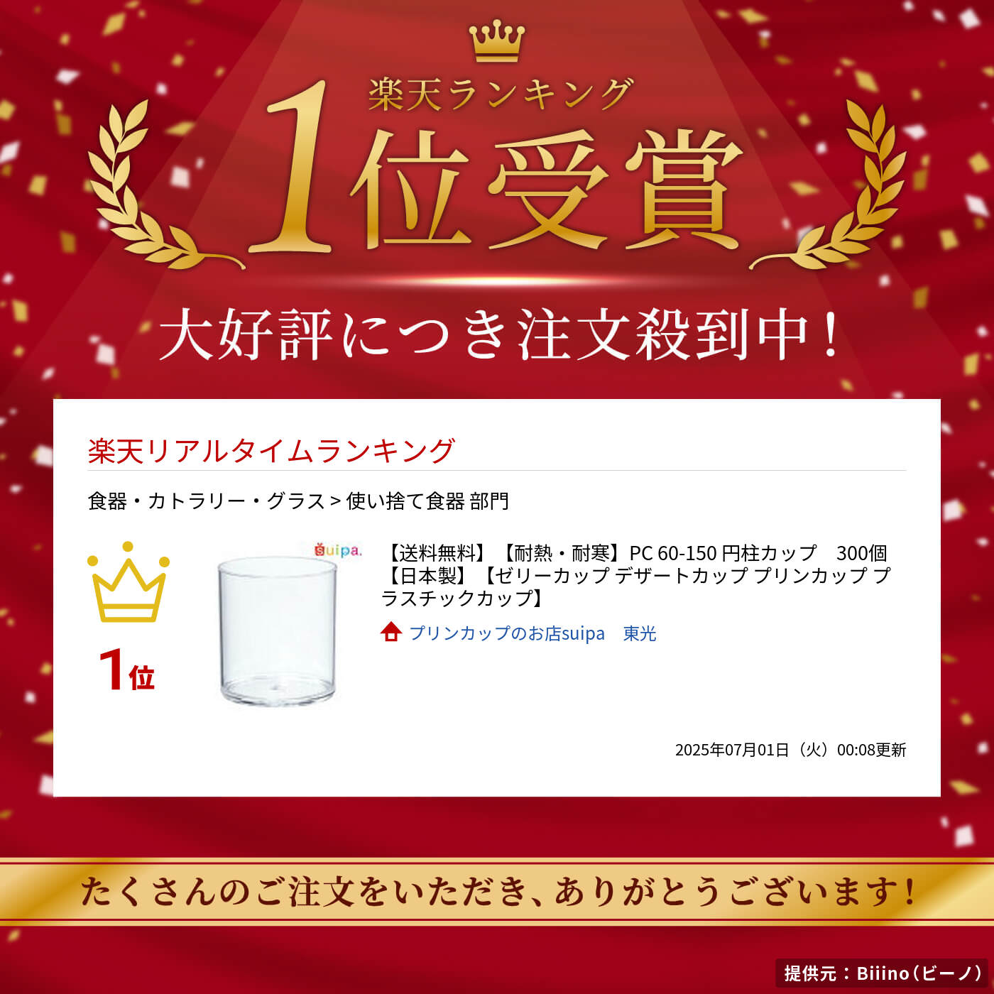 特徴的な傾きのない円筒フォルム。ガラスのような高級感ある厚みのプラスチックが魅力です。 耐熱はもちろん、耐寒OKなので冷凍スイーツにもお使い頂けます。 高級イチオシスイーツへのご使用におすすめです! 数量:300個 サイズ:59.1φ×65H(mm) 容量:150cc 材質:プラスチック(PC) ※耐熱温度は125℃です。 ※耐寒温度は-30℃〜40℃です。 ※耐熱温度は保証値ではありません。 容器の厚み・形状・使用用途など によって異なります。 必ずテストしてからご使用ください。 ※透明性が高く、割れにくい耐熱材質で、耐寒性もあります。 300個セット 150個セット 32,670円 ※1個あたり108.9円 18,513円 ※1個あたり123.42円 6個セット 873円 ※1個あたり145.5円 ※こちらの蓋は耐寒ではございません。 (1) (2) (3) ※こちらの蓋は耐寒です。 (1)