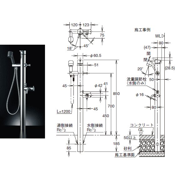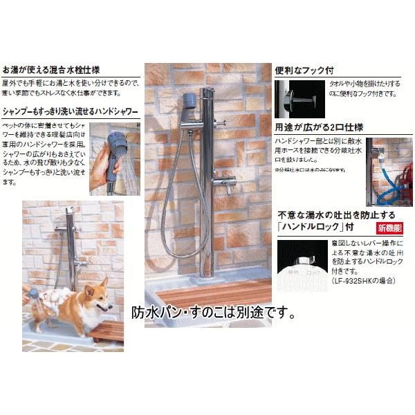 LIXIL・INAX シャワー付水栓柱 品番:LF-932SHK 屋外で手軽に「シャワー」や「お湯」が使える多目的用途の水栓柱です。 ペットのシャンプーや足洗いに。屋外でお湯のシャワーが使えて、ペットも大喜びです。 ペットの体に密着させてもシャワーを維持できる理髪店向け専用のハンドシャワーを採用。 シャワーの広がりもおさえているため、水の飛び散りも少なく、シャンプーもすっきりと洗い流せます。 不意な湯水の吐出を防止するハンドルロック付。 ガーデニング、洗車などにも最適です。 スノーボードやサーフボードなどレジャー用品のお手入れにも便利です。 使いやすいシングルレバー仕様。吐水、止水、水温調整がワンアクションで出来ます。 タオルや小物などが掛けれるフック付。 使い勝手のよいハンドシャワー。ホース長は1200ミリです。 ハンドシャワーとは別に吐水口が付いています。散水用ホースなど接続出来ます。 (吐水口は水のみになります。) ペット水栓柱専用防水パン、すのこは下記関連商品よりご購入が可能です。 送料は無料です。 沖縄県・離島は送料別途2,000円です。 通常翌〜2営業日での出荷になります。