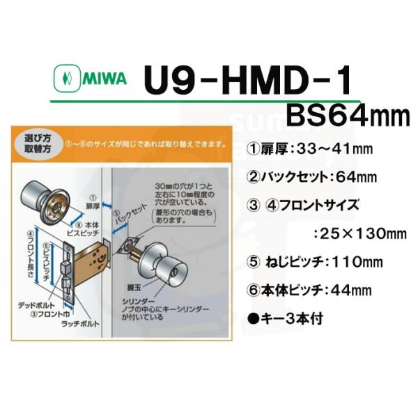 MIWA 本締付モノロック U9 HMD-1 BS64 バックセット64mm ドア厚 33~41mm