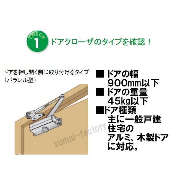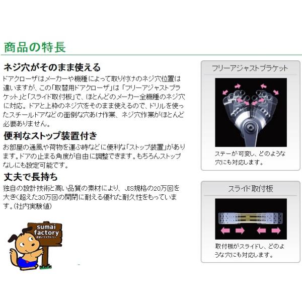 リョービの取替え用ドアクローザ DIYで楽々取替えができるので大人気商品です ■ネジ穴がそのまま使える ドアクローザはメーカー、機種によって取り付けのネジ穴位置 は違いますが、この「取替用ドアクローザ」は「フリーアジャスト ブラケット」と「スライド取付板」で、ほとんどのメーカー全機種 のネジ穴に対応します。 ドアと上枠のネジ穴をそのまま使えるので、ドリルを使ったスチール ドアなどの面倒な穴あけ作業ネジ穴作業がほとんど必要ありません ■便利なストップ装置付き お部屋の通風や荷物を運ぶ時などに便利な「ストップ装置」があります ドアの止まる角度が自由に調整できます もちろんストップなしにも設定可能です ■丈夫で長持ち 独自の設計技術と高い品質の素材によりJIS規格の20万回を大きく超えた 30万回の開閉に耐える優れた耐久性をもっています ※ただしすべての取替えが可能ではありません ■商品内容 品番:S-202P アームタイプ:パラレル型(ドアを押し開く側に取り付けるタイプ) 適用ドア:一般戸建て住宅用木製又はアルミドア玄関、勝手口 対応ドア巾: W900mmまで 対応ドア重量:重量45Kg以下 カラー:シルバー.ブラウン(C1) ※スタンダードタイプ発売中です!