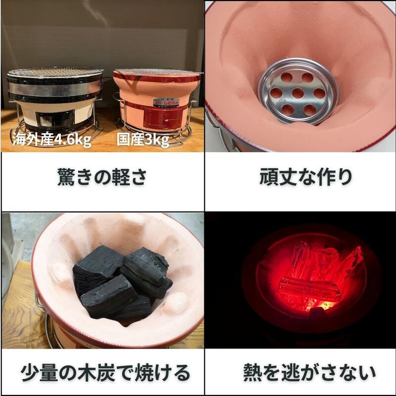 素材 珪藻土 メーカー キンカ(国産) サイズ 直径25cm 高さ17.5cm 重さ 3kg 内径 直径20cm 深さ(目皿まで)11cm アミサイズ 22×22cm 付属品 網・ステンレス目皿 使用人数 2〜3人 使用出来る燃料 木炭・オガ炭・備長炭・豆炭 ステン目皿のサイズ 10.5cm こんな方に オススメ♪ 焼く面が広いので焼肉屋さんの業務用やご家庭で焼肉を楽しみたいときにおすすめなコンロです。 テーブルで焼く時も手が疲れないように高さが低めの七厘です。 角型と比べ焼く面は少なくなりますが熱を中心に集めるので少ない炭の量で燃焼できます。 注意点 1.換気設備の無い室内での使用は煙や匂いが出るためお勧めしません。 2.テーブルの上でのご使用は熱がたまり焦げることがありますので耐熱の板などを敷いてご使用ください。 3.お手入れは水などで絶対に洗わないで下さい。汚れは取れません。 演出効果 ★★★ 運び易さ ★★★ 焼き易さ ★★★ 卓上での使い易さ ★★★【別売り関連商品適合表】 ステンレス焼網中230×230 〇 付属の網とほぼ同じサイズです。 ステンレス焼網大270×270 〇 ※七輪からはみ出る大きさです。 ステンレス大丸焼網280mm 〇 ※七輪からはみ出る大きさです。 コンロトップカバー × サイズが合いません。 ※七輪は若干の色むらや、色の剥がれがありますのでご了承下さい。