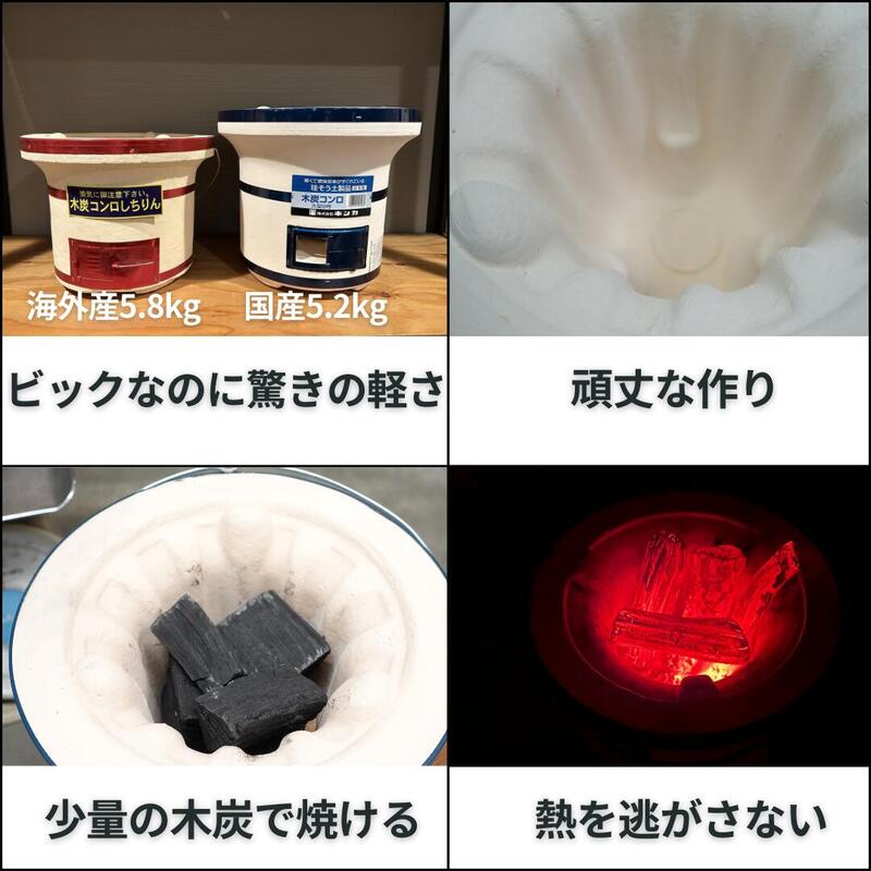 素材 珪藻土 メーカー キンカ(国産) 製造元 鍵主工業(国産) サイズ 直径28.5cm 高さ25cm 重さ 5.2kg 内径 直径21cm 深さ(目皿まで)14cm 使用人数 2〜3人 使用出来る燃料 木炭・オガ炭・備長炭・豆炭 ステンレス目皿の サイズ 12cm こんな方に おすすめ♪ 焼肉・BBQなどに使用でき、防災や非常用として鍋を乗せてお湯を沸かしたり煮炊きなどガスコンロの代わりにもなるオールマイティーに使用できるコンロです。 昔ながらの作りは肉厚で堅牢な作りで上には3つのコブがあるのでやかん等を乗せても火が消えません。 角型と比べ焼く面は少なくなりますが熱を中心に集めるので少ない炭の量で燃焼できます。 テーブルや卓上での使用は高さがあるため向きません。 上置きを乗せて業務用の火種コンロとしてもご利用頂いております。 お手入れは水などで絶対に洗わないで下さい。汚れは取れません。 ※網は付属していません。 耐久性(丈夫さ) ★★★ 運び易さ ★★★ 焼き易さ ★★★ 卓上での使い易さ ★★★【別売り関連商品適合表】 ステンレス焼網大270×270 〇 七輪に合います。角が出ますが焼けたものを、端っこにおけるスペースがあります。 ステンレス大丸焼網280mm 〇 七輪に合うサイズです。 コンロトップカバー × 能登七輪大用の商品になります。 ※七輪は若干の色むらや、色の剥がれがありますのでご了承下さい。 ※網は付属しておりません。※配送は段ボールに梱包してお送り致します。