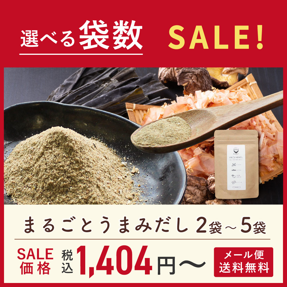 【離乳食での利用について】 まるごとうまみだしを離乳食で使用する場合は青魚であるいりこが含まれますので9か月からのご使用を推奨しております。 原材料 鰹荒節(鹿児島県製造)、いわし煮干し粉末(鹿児島県製造)、昆布粉末、椎茸粉末 アレルギー品目 原材料は煮干し(イワシ)と鰹節(カツオ)、椎茸、昆布のみです。特定原材料7品目(卵・乳・小麦・そば・落花生・えび・かに)は含まれておりません。 ※青魚でまれにアレルギー反応が出る方もいらっしゃるので、お心当たりのある方はお気を付けください 内容量 60g×2袋 賞味期限 製造日から約13ヶ月(常温) 栄養成分表示(100gあたり) ■エネルギー:352kcal ■たんぱく質:66.3g ■脂質:5.8g ■炭水化物:8.2 ■食塩相当量:2.53g ※ 栄養成分表示の「食塩相当量」は原材料の由来のもので食塩は不使用です ご使用方法 ・ 利用開始の目安:生後9ヶ月頃〜 お味噌汁1杯(150ml)に対して小さじ半分(約1.5g)を目安に、お好みに応じて量をご調整ください。 お味噌汁だけでなく、煮物や炒め物などいろんなレシピにお出汁や隠し味としてご利用いただけます。 お届け方法 (メール便・配送追跡番号あり・代金引換不可) ご注意 ●高温多湿を避け冷暗所に保管し、開封後はチャックをしっかりと閉めて、お早めにお召し上がりください。(開封後は要冷蔵) その他特記事項 放射能検査済み:乳幼児規格適用食品↓↓ クーポンやセール情報は公式LINEアカウントでも配信中です ↓↓ 【離乳食での利用について】 まるごとうまみだしを離乳食で使用する場合は青魚であるいりこが含まれますので9か月からのご使用を推奨しております。