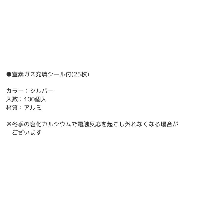 ●窒素ガス充填シール付(25枚) カラー:シルバー 入数:100個入 材質:アルミ ※冬季の塩化カルシウムで電触反応を起こし外れなくなる場合がございます【海外製品について】海外製品は国内製品のように検品基準が厳しくないため、製品の使用上に問題がないような傷や汚れ、外箱やパッケージの損傷等がある場合がございます。海外基準の検品に合格している商品に関しましては、不具合・不良品の対象外となりますのでご了承の上ご購入をお願い致します。BAOLONG(バローン) N2バルブキャップ シルバー 100個BAOLONG(バローン) N2バルブキャップ ブルー 100個BAOLONG(バローン) N2バルブキャップ シルバー(寒冷地用) 100個