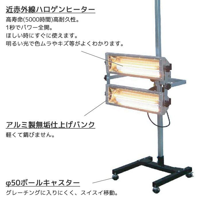 シンプルな2灯式近赤外線ハロゲンヒーター。 高寿命(5000時間)高耐久性。 1秒でパワー全開。 ほしい時にすぐに使えます。 明るい光で色ムラやキズ等がよくわかります。 ●アルミ製無垢仕上げバンク 軽くて錆びません。 ●φ50ボールキャスター グレーチングに入りにくく、スイスイ移動。 ●たて、よこ、ななめ 角度調整も自由自在。 あらゆる場所の乾燥に使えます。 ●60分タイマー付 60分タイマー付で温度管理も楽々。 ●ヒーター個別スイッチ 補修面積に応じて1灯・2灯の切り替え可能。 定格電力:単相200V/2.0kw バンクサイズ:W600xH460mm ポール高:約1.9m(地上高) 電源コード:10m(4P20Aプラグ付) タイマー:60分(連続運転可能) スイッチ:ヒーター個別スイッチ付 スタンド:φ50ポールキャスター付 【基準乾燥時間(目安)】 ・パテ 4〜5分 ・10:1サフ 8〜10分 ・10:1クリヤー 10〜15分 ・2:1クリヤー 15〜20分