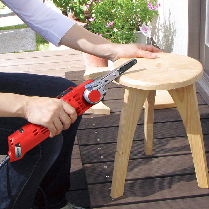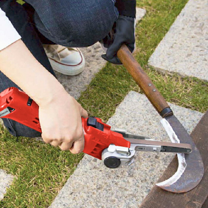 木材の研削・刃物の研磨に。 作業に合わせて角度調節できる可変ヘッド。 すぐに使えるエンドレスベルト付。 変速機能で削りすぎ、刃焼けを防止。 作業性のよいスライド式ロックスイッチ。 工具レスで簡単、ベルト交換。 ベルト寸法:10x330mm ベルト速度:6.6〜8.0m/s 回転数:5500〜6700min-1 電流:1.9A 消費電力:180W 質量:1.0kg サイズ:長さ380x幅70x高さ66mm 付属品:エンドレスベルト(中仕上#120)、エンドレスベルト(仕上#400)