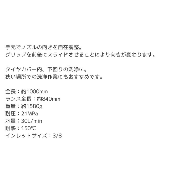 手元でノズルの向きを自在調整。 グリップを前後にスライドさせることにより向きが変わります。 タイヤカバー内、下回りの洗浄に。 狭い場所での洗浄作業にもおすすめです。 全長:約1000mm ランス全長:約840mm 重量:約1580g 耐圧:21MPa 水量:30L/min 耐熱:150℃ インレットサイズ:3/8FLUTECH(フルテック) プッシュプルランス付洗浄ガン P25-PPL85SFLUTECH(フルテック) プッシュプルランス付洗浄ガン P25-PPL100SFLUTECH(フルテック) ベントランス付洗浄ガン 3P-P25-LBS5FLUTECH(フルテック) ベントランス付洗浄ガン 3P-P25-LBS7