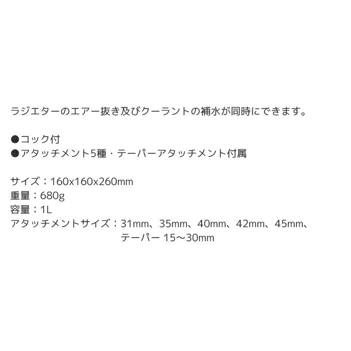 ラジエターのエアー抜き及びクーラントの補水が同時にできます。 ●コック付 ●アタッチメント5種・テーパーアタッチメント付属 サイズ:160x160x260mm 重量:680g 容量:1L アタッチメントサイズ:31mm、35mm、40mm、42mm、45mm、テーパー 15〜30mm【海外製品について】海外製品は国内製品のように検品基準が厳しくないため、製品の使用上に問題がないような傷や汚れ、外箱やパッケージの損傷等がある場合がございます。海外基準の検品に合格している商品に関しましては、不具合・不良品の対象外となりますのでご了承の上ご購入をお願い致します。WOLF'S HEAD(ウルフヘッド) ラジエーターエアブリーダー RT-919KWOLF'S HEAD(ウルフヘッド) ラジエーターエアブリーダー RT-919K1