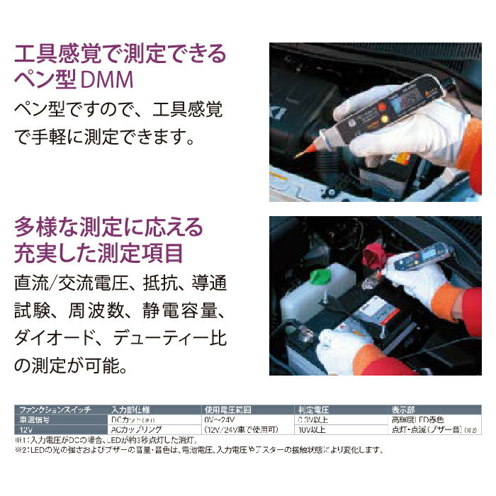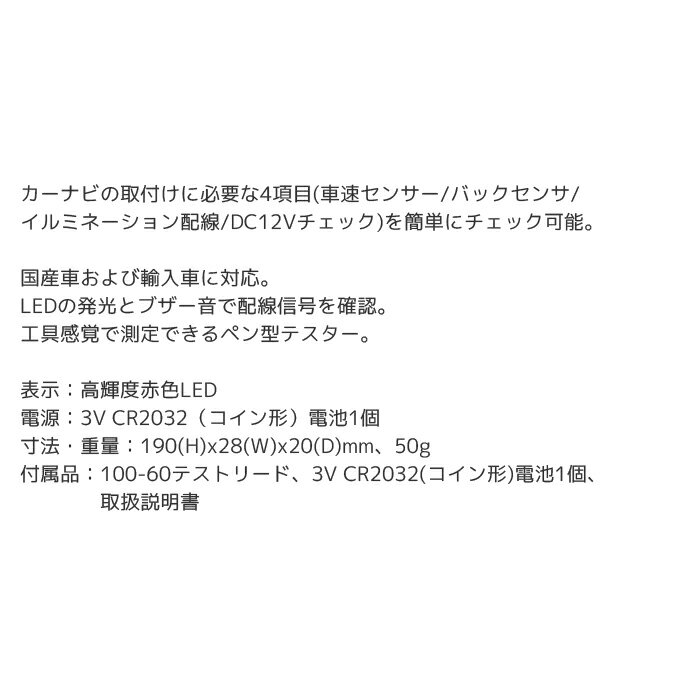 カーナビの取付けに必要な4項目(車速センサー/バックセンサ/イルミネーション配線/DC12Vチェック)を簡単にチェック可能。 国産車および輸入車に対応。 LEDの発光とブザー音で配線信号を確認。 工具感覚で測定できるペン型テスター。 表示:高輝度赤色LED 電源:3V CR2032(コイン形)電池1個 寸法・重量:190(H)x28(W)x20(D)mm、50g 付属品:100-60テストリード、3V CR2032(コイン形)電池1個、取扱説明書