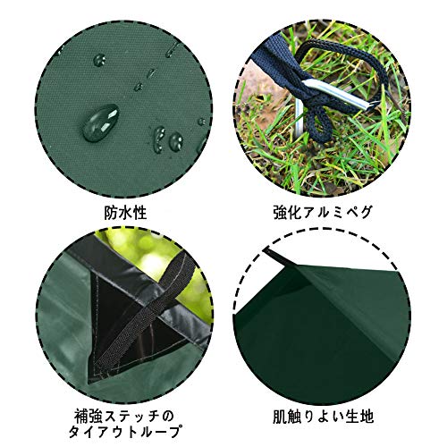 色:グリーン300*300 【様々なシーンで活躍】:登山、キャンプ、釣り、旅行、パーティーなどに最適です。タープを広げ、床に敷いてピクニックマットとしても使えます。釘やロープを使って日よけや雨よけにすることもできる。【高い耐水性能】210T防水ポリエステルの製造、タープ本体もしっかりと縫製されているので縫い目から、結構な雨でも雨漏りすることなく快適です。生地には高耐水加工が施されており、耐水圧はなんと3000mm以上。【遮光性&遮熱性】遮熱効果が優れたUVカットで、真夏の暑さ·紫外線から守ってくれます。アウトドアだけでなく、運動会やピクニック、野外フェスなどあらゆるレジャーシートで活躍してくれます。【耐久性・超軽量】この素材は軽くて柔軟性があり、強度があるので、擦り傷やパンクを防ぐことができます。 製品は、6本のペグ、6本のロープとバッグが含まれている。 ペグはアルミ製なので、とても丈夫で錆びる心配もありません。 旅行に最適なテントタープです。