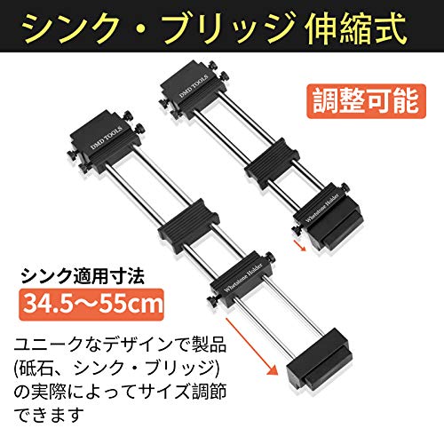 【砥石台 材質】 附属品:1.滑り止めマット 2枚 ※滑り止めマットが付いていますので、テーブルや作業台の上でも安全に使用することができます。 2.六角レンチ ※附属の六角レンチ部品でスライドレールの水平位置を調節できます。 砥石台軸:18-8ステンレス製 砥石台座: ゴム素材&アルミ素材&ポリエチレン素材 砥石台質量: 1.23Kg 砥石適合寸法: 75*275mm(調整可能) シンク適用寸法: 34.5*55cm(調整可能) 砥石台寸法:全長415*幅105*厚さ52mm *錆に強い高品質な18-8ステンレス製の為、変色、サビに絶対の安心感! ご使用後はサッと洗って水切りするだけでお手入れも簡単です。【シンク・ブリッジ部分の長さ 伸縮式調整可能】 ※シンク・ブリッジ部分の長さが伸縮式自在で、キッチンのシンクの広さに合わせて、砥石固定台のサイズを自由に伸縮調整することができます。 ※使用できるシンクの奥行は34.5*55cmまでです。【砥石適合サイズ 調整可能】 ※様々な砥石にも合わせられるよう、砥石適合長さ 75*275mm まで調整可能です。 サイズ調整可能で、砥石の広さに合わせて、固定台のサイズを調整することができます。 ※市販の砥石(ダイヤモンド砥石、仕上げ砥の利用となれば研磨作業性は刃物)全てに対応可能なサイズ調整。 ※薄くなった砥石を割ることなくて、砥面の修正、面直し時にもご利用いただけます。【5段式設計、保持力、固定力がよい】 *独特な5段式設計で、しっかり挟んでズレない仕様。砥石が動くことを防止して安定性を高めて最大限に砥石を固定できて、研磨作業をより効果的、効率的に行える砥石専用の固定スタンドです。素人でも簡単に使えます。 *滑り止めマットが付いていますので、テーブルや作業台の上でも安全に使用することができます。 *砥石が折れにくい3点センター付きで砥石割れを抑制し、安定度抜群!力を加えても砥石が割れる心配はありません。 *砥石を滑らせずしっかりと固定させるという小さな工夫が、最高品質で硬い刃先も短時間で研ぎ上げる! *板前、大工、理美容師、刀鍛冶、農具など、ノミ、カンナ、超硬タガネ、ドリルビット、家庭用包丁、業務用包丁、ハサミ、日本刀、包丁、鎌、鍬、セラミック砥石等。