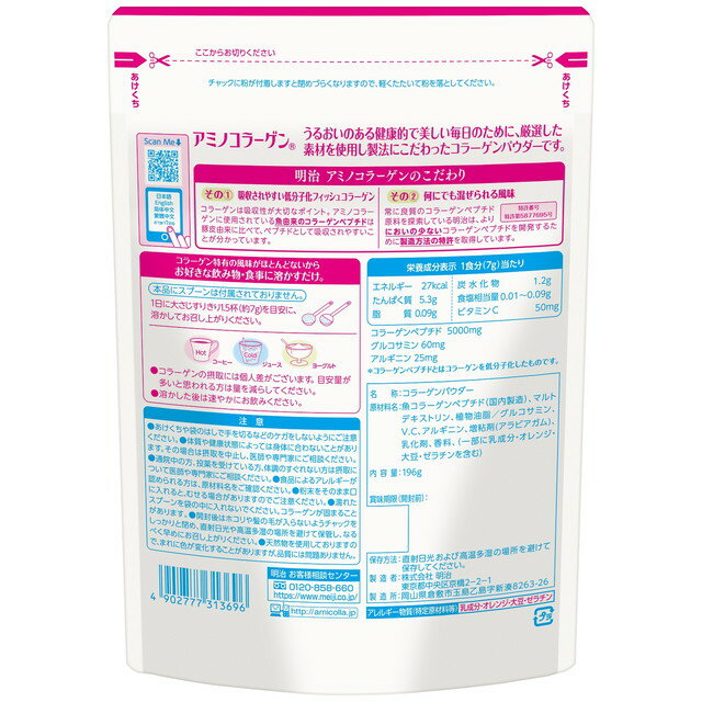 商品名アミノコラーゲン詰め替え用内容量196g商品説明厳選した素材を使用し、製法にこだわったコラーゲンパウダーです。吸収されやすい低分子化フィッシュコラーゲンを使用。何にでも混ぜられる風味で、お好きな飲み物・食事に溶かすだけ。目安量/お召上がり方●本品はアミノコラーゲン(缶)の詰め替え用です。必ず缶に詰め替えてご使用ください。●独特の風味がほどんどないコラーゲンパウダーですので、お好きな飲み物に溶かしてお召し上がりください。※1日の目安量は約7gです。コラーゲンの摂取には個人差がございます。7gが多いと思われる方は量を減らしてください。※溶かした後は速やかにお飲みください。成分・分量【原材料名】魚コラーゲンペプチド、マルトデキストリン、植物油脂、V.C、グルコサミン、アルギニン、増粘剤(アラビアガム)、香料、乳化剤、(原材料の一部に大豆、オレンジ、ゼラチンを含む)アレルゲンゼラチン・オレンジ・大豆、(乳成分、卵、小麦を含む製品と共通の設備で製造しています。)使用上の注意●缶は完全に使いきってきれいにしてからご使用ください。ただし、さびる場合がありますので水で洗わないでください。※詰め替え前に缶の中身が空である事を確認してください。※他の商品とは混ぜないでください。※シールに記載してある管理記号が製品についてのお問い合わせの際に必要になる場合があります。※詰め替え後は缶のフタをしっかり閉めて保管し、なるべく早めにお召し上がりください。 ●粉末をそのまま口に入れると、むせる場合がありますのでご注意ください。●体質や健康状態によっては身体に合わない場合があります。その場合は摂取を中止し、医師や専門家にご相談ください。●通院中の方、投薬を受けている方、体調のすぐれない方は摂取について医師や専門家にご相談ください。●食品によるアレルギーが認められる方は、原材料名をご確認ください。●天然物を使用しておりますので、まれに色が変化することがありますが、品質には問題ありません。保管取扱上の注意直射日光および高温多湿の場所を避けて保存してください。商品区分食品メーカー/輸入元明治製菓株式会社発売元明治製菓株式会社原産国日本問合せ先明治製菓株式会社健康サポートダイヤル電話番号:0120-858660広告文責株式会社サンドラッグ 電話番号:042−369-9091JAN4902777313696ブランドアミノコラーゲン※パッケージ・デザイン等は、予告なしに変更される場合がありますので、予めご了承ください。 ※お届け地域によっては、表記されている日数よりもお届けにお時間を頂く場合がございます。