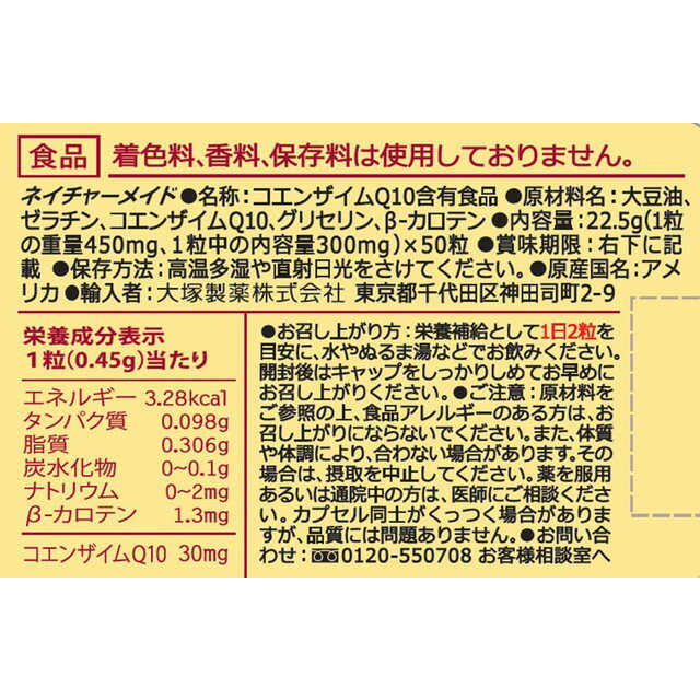 商品名大塚製薬 ネイチャーメイド コエンザイムQ10 50粒内容量50粒商品説明●コエンザイムQ10は、もともと私たちの体内に存在し、エネルギー産生に欠かせない成分です。●ネイチャーメイドは、1971年にアメリカで誕生して以来、サプリメントを専門に研究開発を行なってきた専門ブランドです。栄養に関する最新情報をいち早く入手し、研究開発につなげる姿勢が支持されています。目安量/お召上がり方2粒/かまずに水またはぬるま湯でお飲みください。使用上の注意●原材料をご参照の上、食品アレルギーのある方は、お召し上がりにならないでください。●本品は多量摂取により疾病が治癒したり、より健康が増進するものではありません。●1日の摂取目安量を守ってください。●また、体質や体調により、合わない場合があります。その場合は、摂取を中止してください。薬を服用あるいは通院中の方は、医師にご相談ください。成分・分量栄養成分1粒(0.45g)あたりの栄養成分エネルギー:3.28kcalタンパク質:0.098g脂質:0.306g炭水化物:0〜0.1gナトリウム:0〜2mgコエンザイムQ10:30mg 原材料大豆油・ゼラチン・コエンザイムQ10・グリセリン・β-カロテンアレルゲン大豆・ゼラチン保管取扱上の注意●直射日光の当らない湿気の少ない涼しい所に保管してください。問合せ先大塚製薬株式会社 お客様相談室窓口電話番号:03-3293-3212受付時間:9:00-17:00(土、日、祝日を除く)メーカー/輸入元大塚製薬発売元大塚製薬原産国アメリカ商品区分栄養機能食品広告文責株式会社サンドラッグ/電話番号:0120-009-368JAN4987035264118ブランドネイチャーメイド※パッケージ・デザイン等は、予告なしに変更される場合がありますので、予めご了承ください。 ※お届け地域によっては、表記されている日数よりもお届けにお時間を頂く場合がございます。