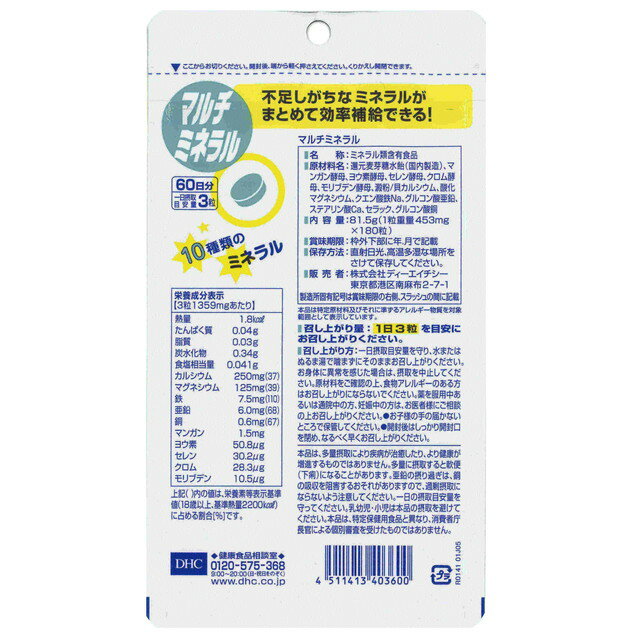 商品名DHC マルチミネラル 60日(新) 内容量180粒 商品説明 目安量/お召上がり方水またはぬるま湯でお召し上がりください。お身体に異常を感じた場合は飲用を中止してください。原材料をご確認のうえ、食品アレルギーのある方はお召しあがりにならないでください。薬を服用中あるいは通院中の方、妊娠中の方はお医者様にご相談の上、お召し上がりください。 使用上の注意 成分・分量還元麦芽糖水飴、マンガン酵母、ヨウ素酵母、セレン酵母、クロム酵母、モリブデン酵母、澱粉、貝カルシウム、酸化マグネシウム、クエン酸鉄Na、グルコン酸亜鉛、ステアリン酸カルシウム、グルコン酸銅、ヒドロキシプロピルメチルセルロース アレルゲン 保管取扱上の注意直射日光、高温多湿な場所をさけての保管してください。お子様の手の届かないところで保管してください。開封後はしっかり開封口を閉め、なるべく早くお召し上がりください。 問合せ先株式会社ディーエイチシー0120-575-368 メーカー/輸入元 発売元株式会社ディーエイチシー 原産国 商品区分健康食品 広告文責株式会社サンドラッグ/電話番号:0120-009-368 JAN4511413403600x3 ブランドDHC※パッケージ・デザイン等は、予告なしに変更される場合がありますので、予めご了承ください。※お届け地域によっては、表記されている日数よりもお届けにお時間を頂く場合がございます。