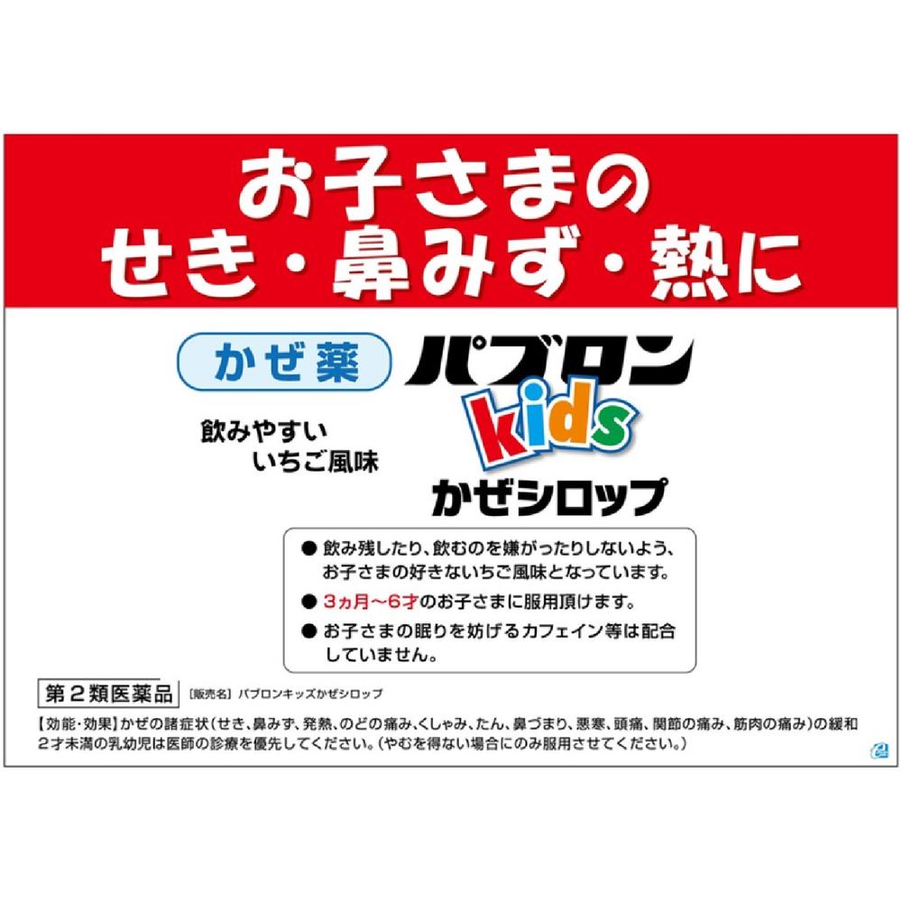 【注意!】こちらの商品は医薬品です。※医薬品は使用上の注意をよく読み用法・用量を守って正しくお使い下さい。・熱があまり高くなくても、ぐったりしている、食事を全くとらないなどの時には、受診することをお勧めします。・2歳未満のお子様は、休日・夜間などやむを得ない場合以外は、受診することをお勧めします。・風邪を治すには、休養と栄養も大切です。食欲が落ちている時は、間食させたり、糖分を含む水分を補給させたりなど工夫しましょう。・お使いになって何か気になる症状が出た場合は、使用を中止し、医師・薬剤師・登録販売者にご相談下さい。・使用前に、よく添付文書をお読みになってからご使用下さい。その際、ご不明な点がございましたら、薬剤師・登録販売者にご相談下さい。商品説明(製品の特徴)お子さまのために いちご風味のシロップタイプのかぜ薬●パブロンキッズかぜシロップは、お子さまの好きないちご風味にすることで、飲み残したり飲むのを嫌がったりしないよう「飲みやすさ」をめざした設計です。●3ヵ月以上のお子さまから服用いただけます。●お子さまの眠りをさまたげるカフェイン、dl-メチルエフェドリン塩酸塩等を配合していません。使用上の注意1次の人は服用しないでください(1)本剤又は本剤の成分によりアレルギー症状を起こしたことがある人。(2)本剤又は他のかぜ薬、解熱鎮痛薬を服用してぜんそくを起こしたことがある人。2本剤を服用している間は、次のいずれの医薬品も使用しないでください他のかぜ薬、解熱鎮痛薬、鎮静薬、鎮咳去痰薬、抗ヒスタミン剤を含有する内服薬等(鼻炎用内服薬、乗物酔い薬、アレルギー用薬等)3服用後、乗物又は機械類の運転操作をしないでください(眠気等があらわれることがあります)4服用前後は飲酒しないでください5長期連用しないでください効能/効果かぜの諸症状(発熱、せき、鼻みず、のどの痛み、くしゃみ、たん、鼻づまり、悪寒(発熱によるさむけ)、頭痛、関節の痛み、筋肉の痛み)の緩和用法/用量添付の目盛付コップで次の量をはかり、1日3回毎食後、及び必要な場合には就寝前に服用してください。また場合によっては、約4時間の間隔をおいて1日6回まで服用することができます。3〜6才:1回10mL 1〜2才:1回7.5mL6ヵ月〜1才未満:1回6mL3〜6ヵ月未満:1回5mL3ヵ月未満:服用しないこと成分/分量60mL 中デキストロメトルファン臭化水素酸塩水和物 16mg グアイフェネシン 83.3mgクロルフェニラミンマレイン酸塩 2.5mg アセトアミノフェン 300mg添加物白糖、スクラロース、安息香酸、パラベン、クエン酸Na、クエン酸、黄色5号、香料、バニリン保管及び取扱上の注意※こちらの商品は、使用期限が【8ヶ月】以上ある商品を販売させていただいております※(1)直射日光の当たらない涼しい所に密栓して保管してください。(2)小児の手の届かない所に保管してください。(3)他の容器に入れ替えないでください。(誤用の原因になったり品質が変わることがあります)(4)使用期限を過ぎた製品は服用しないでください。なお、使用期限内であっても、開封後は6 ヵ月以内に服用してください。(品質保持のため)問い合わせ先大正製薬株式会社お客様119番室電話番号:03-3985-1800受付時間:8:30〜17:00(土、日、祝日を除く)メーカー名(製造販売会社)大正製薬株式会社ブランド名パブロン剤形シロップ広告文責株式会社サンドラッグ/電話番号:0120-009-368JAN4987306047761 ※パッケージ・デザイン・内容等は、リニューアルにより予告なしに変更される場合がありますので、予めご了承ください。※お届け地域によっては、表記されている日数よりもお届けにお時間を頂く場合がございます。パブロン、パブロンキッズ、かぜ薬、総合感冒薬、子供用かぜ薬