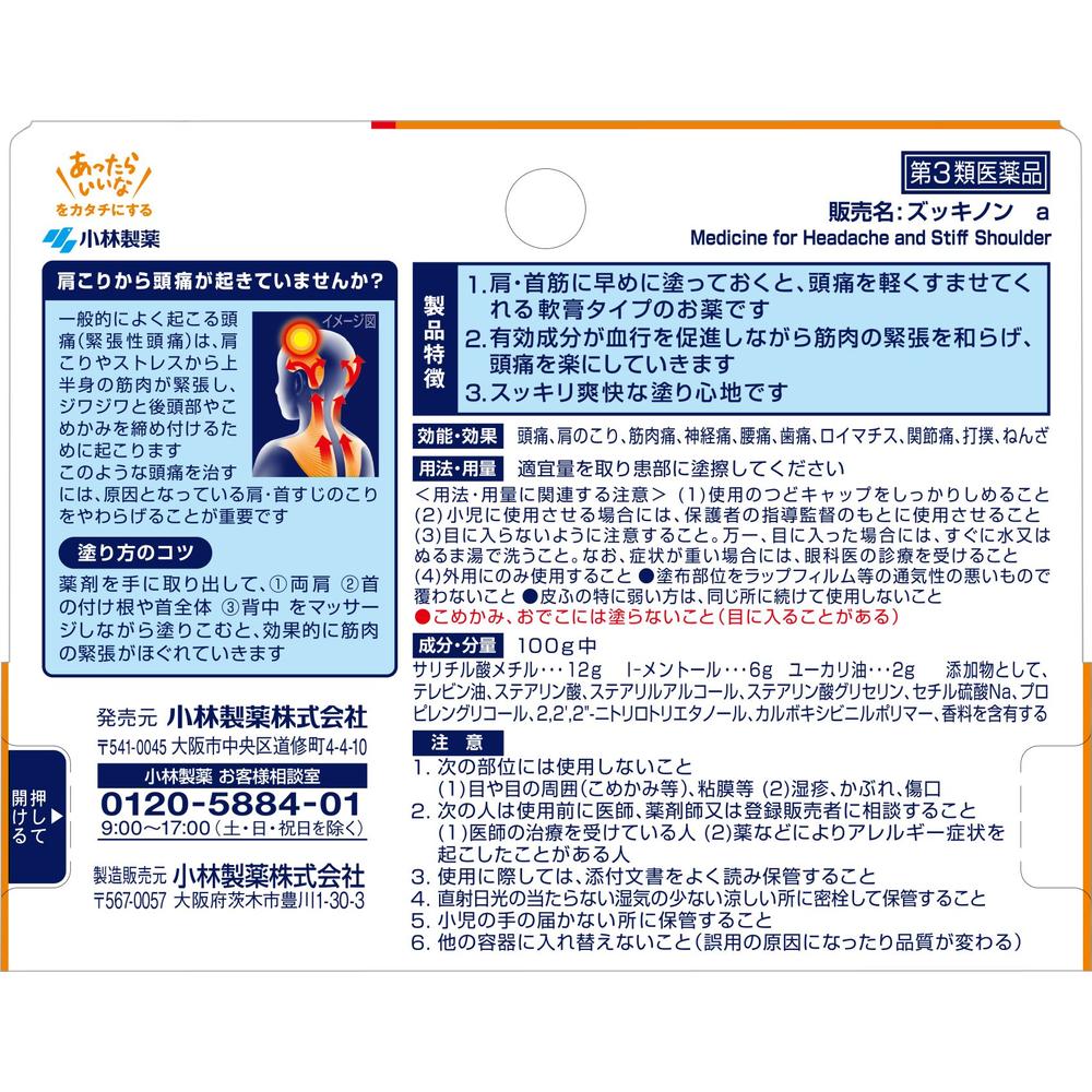 【注意!】こちらの商品は医薬品です。医薬品は使用上の注意をよく読み用法・用量を守って正しくお使い下さい。 商品名塗るズッキノン 内容量15g 商品説明(製品の特徴)●肩・首筋に早めに塗っておくと、頭痛を軽くすませてくれる軟膏タイプのお薬です●スッキリ爽快な塗り心地です●有効成分が血行を促進しながら筋肉の緊張を和らげ、頭痛を楽にしていきます 使用上の注意● してはいけないこと(守らないと現在の症状が悪化したり、副作用が起こりやすくなる) 次の部位には使用しないこと (1)目や目の周囲(こめかみなど)、粘膜など (2)湿疹、かぶれ、傷口 効能・効果<効能・効果> 頭痛、肩のこり、筋肉痛、神経痛、腰痛、歯痛、ロイマチス、関節痛、打撲、ねんざ 用法・用量<用法・用量> 適宜量を取り患部に塗擦してください <用法・用量に関連する注意> (1)使用のつどキャップをしっかりしめること (2)小児に使用させる場合には、保護者の指導監督のもとに使用させること (3)目に入らないように注意すること。万一、目に入った場合には、すぐに水またはぬるま湯で洗うこと。 なお、症状が重い場合には、眼科医の診療を受けること (4)外用にのみ使用すること ●塗擦部位をラップフィルムなどの通気性の悪い 成分・分量成分(100g中)サリチル酸メチル 12g l‐メントール 6g ユーカリ油 2g 添加物添加物として、テレビン油、ステアリン酸、ステアリルアルコール、モノステアリン酸グリセリン、セチル硫酸Na、プロピレングリコール、トリエタノールアミン、カルボキシビニルポリマー、香料を含有する 保管及び取扱上の注意(1)直射日光の当たらない湿気の少ない涼しいところに密栓して保管すること (2)小児の手の届かないところに保管すること (3)他の容器に入れ替えないこと(誤用の原因になったり品質が変わる) 問合せ先小林製薬株式会社 お客様相談室0120‐5884‐01受付時間9:00〜17:00(土・日・祝日を除く) 製造販売会社(メーカー)小林製薬株式会社〒567‐0057大阪府茨木市豊川1‐30‐3 販売会社(発売元)小林製薬株式会社 剤形軟膏 リスク区分(商品区分)第3類医薬品 広告文責株式会社サンドラッグ/電話番号:0120‐009‐368 JANコード4987072083239 ブランド塗るズッキノン ※パッケージ・デザイン等は、予告なしに変更される場合がありますので、予めご了承ください。 ※お届け地域によっては、表記されている日数よりもお届けにお時間を頂く場合がございます。