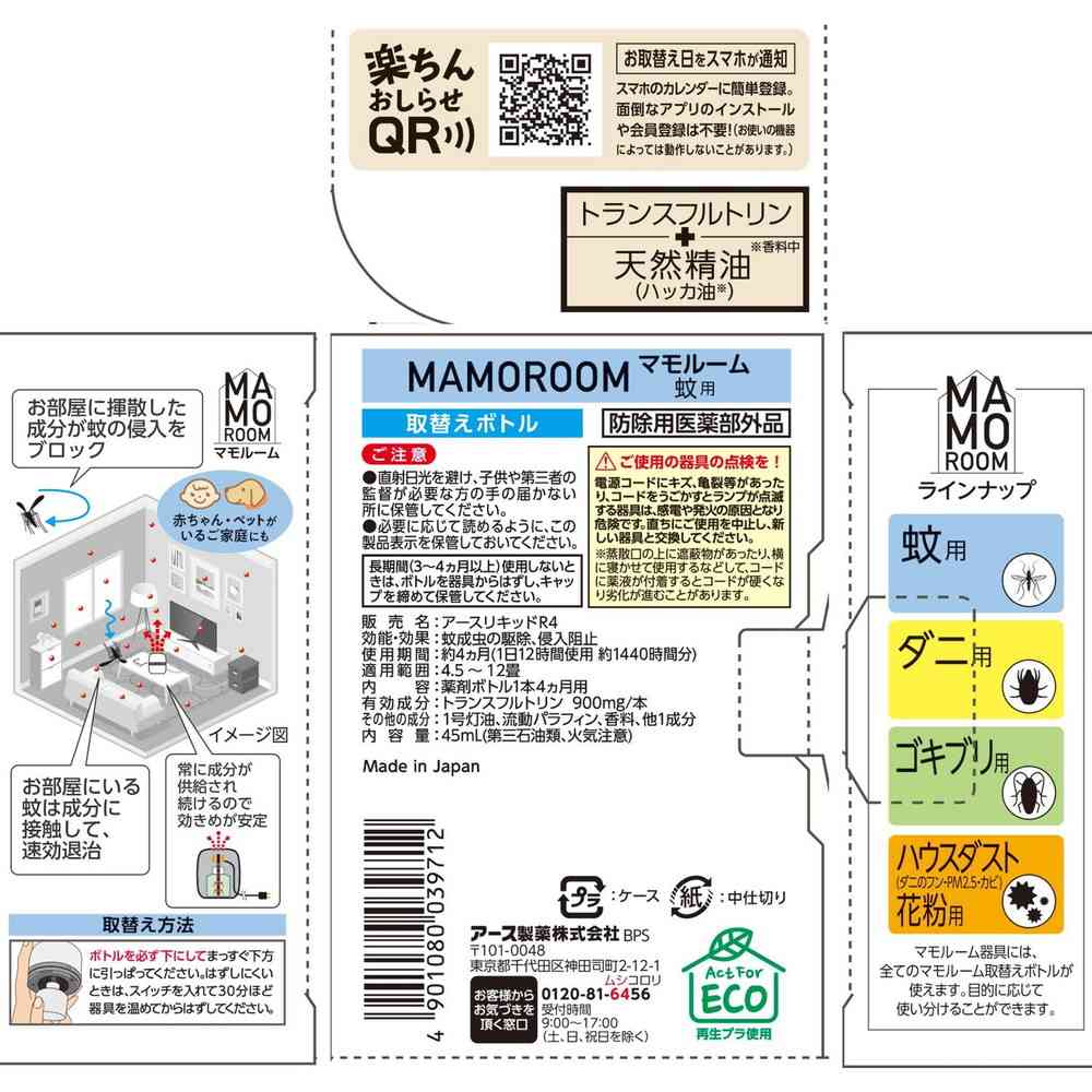 ■商品説明(製品の特徴) ●蚊からお部屋を守る●スイッチONするだけで、超マイクロ粒子がお部屋のすみずみまで広がります。●お部屋にいる蚊は成分に接触して、速効退治●常に成分が供給され続けるので効きめが安定●お部屋に揮散した成分が蚊の侵入をブロック●トランスフルトリン+天然精油(ハッカ油※)※香料中【使用範囲】4.5畳〜12畳【効果持続期間】約1440時間(1日12時間使用で120日間)【防除用医薬部外品】■使用上の注意 ●ご使用前によく読んで正しくお使いください。●必要に応じて読めるよう、使用説明書を保管しておくようにしてください。●万一身体に異常が起きた場合や、液を誤って飲み込んだ場合は、直ちに本品がピレスロイド系薬剤を含む商品であることを医師に告げて診療を受けること。●定められた使用方法・使用量を必ず守ること。●ボトルの芯には薬剤がついているので直接手を触れないこと。万一、皮膚に薬剤がついた場合は、石けんを用いてよく洗うこと。●閉めきった部屋や狭い部屋で使用する場合は、時々注意して部屋の換気をすること。体質や体調によっては頭痛、のどの痛み、不快感などの原因となります。●アレルギー体質の人は使用に注意すること。●器具に針金やピン等を差し込んだり、ぬれた手で器具に触れたりしないこと。また器具やボトルに水・油等の液体をかけないこと。感電や故障の原因となります。●使用中、器具上部や蒸散口は熱くなるので、手で触れたり、中に指を入れたりしないこと。やけどの原因となる恐れがあります。●使用中及び使用後は、子供の手に触れさせないこと。●器具は正常な状態で使用し、横や逆さにしたり、吊るして使用しないこと。また、器具を落としたり、衝撃を与えないこと。●火気に注意し、直接炎を近づけないこと。●器具の上に新聞、ふとん、毛布、衣類などをかけないこと。熱がこもってコゲたり、器具が変形することがあります。●毛足の長いじゅうたんの上では使用しないでください。長時間使用すると、液漏れする場合があります。●液漏れの原因となることがあるので、直接日光があたるところや、AV機器の上など高温になるところには置かないこと。●ボトルの芯は固定されているので、無理に引っぱったり、動かしたりしないこと。芯が折れて使用できなくなります。●まれに液の色が濃い場合がありますが、効力に差はありません。●蒸散成分がまれにうすい白煙として見えることがありますが、異常ではありません。●風が蒸散口にあたるなどの使用環境により、蒸散不良となり液漏れしたり、十分な効果が得られないことがあります。●通電中は薬剤が連続して揮散するので、使用しないときは必ずスイッチを切ること。●使用済みの空容器は適切に処分すること。●マモルームのボトル以外のボトルを使用した場合の有効性、安全性は確認しておらず、また、発火等火災の危険を生じるおそれがありますので、マモルームのボトル以外は使用しないでください。万一誤った使用方法によって生じたトラブルには、弊社では責任を負いかねますのであらかじめご容赦ください。●火気注意■効能・効果 蚊成虫の駆除、侵入阻止■用法・用量 ●ボトルのキャップを回し、キャップが芯に触れないようにゆっくり真上に引き抜いてください。芯は折れることがありますので、ていねいにお取り扱いください。(キャップはボトルを保管する際に必要です。捨てずに保管しておいてください。)●器具(下)の▲LOCKからOPENにスライドさせ、器具(上)をまっすぐ持ち上げてください。●ボトルを器具(上)の下方よりカチッと音がするまで確実に差し込んでセットしてください。その際、器具上部の蒸散口の中を見て、黒色の芯がリングヒーター(銀色)に触れないようにしてください。●器具(下)を下方より確実に押し込んでください。●器具(下)の▲をOPENからLOCKにスライドさせてください。●プラグをコンセント(家庭用100Vの電源)に差し込みスイッチを入れてください。しばらくすると薬剤が部屋中に揮散を始めます。電源コードに重いものを載せたり、機器にはさまないでください。●取替え方法:ボトルを必ず下にしてまっすぐ下方に引っぱってください。残液量が「おとりかえライン」であれば、あと1〜2週間使用できます。(1日12時間通電の場合)●蒸散口のある方が器具(上)です。上下逆に使用すると液漏れ等の可能性がありますのでご注意ください。●ご使用の器具の点検を!●電源コードにキズ、亀裂等があったり、コードを動かすとランプが点滅する器具は、感電や発火の原因となり危険です。直ちにご使用を中止し、新しい器具と交換してください。※蒸散口の上に遮蔽物があったり、横に寝かせて使用するなどして、コードに薬液が付着するとコードが硬くなり劣化が進むことがあります。※電源コードは交換することができません。コードが破損した場合は、器具を破棄してください。器具を長年(7〜8年)使用