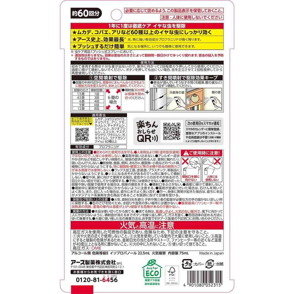 ■商品説明(製品の特徴) ●虫ストレスゼロへ。1度で1年効く。ムカデ、コバエ、アリなど ※1年経過後の処理面に虫を強制接触させ、駆除効果を確認しています。使用環境、害虫の種類により、効果の持続は異なります。 ※清掃などによって、薬剤量が低下すると持続が短くなる場合があります。効果が感じられなくなった場合は、追加処理してください。 ●空間にプッシュするだけ。家中まるごと駆除効果キープ ●年に1度の徹底ケア。事前準備、後片付け不要でいつでも手軽にお使いいただけます。 ●有効成分テネべナール(一般名:ブロフラニリド)配合で、すき間に予め噴射しておけば、1年間、害虫のいない空間が続きます。(使用環境、害虫の種類により持続は異なります。) ●従来の有効成分(ピレスロイド系)が効きにくい害虫までしっかり駆除できます。 ●1プッシュ式スプレー ●テネベナール(一般名:ブロフラニリド)は三井化学アグロ株式会社の登録商標です。 【適用害虫】ムカデ、ショウジョウバエ、チョウバエ、アリ、クモ、チャタテムシ、シバンムシ、カツオブシムシ、ユスリカ、ヤスデ、ゲジゲジ、ワラジムシ、ガ、キクイムシ、コナナガシンクイなど50種以上■使用上の注意 ●必要に応じて読めるよう、使用説明書を保管しておくこと。●注意ー人体に使用しないでください。●逆さまにして使用しない。●定められた使用方法を守る。●人体用虫よけ剤(塗布型忌避剤)ではないので、人体には使用しない。●薬剤を吸い込まない。アレルギーやかぶれなどを起こしやすい体質の人、喘息の症状のある人は、薬剤に触れたり、吸い込んだりしない。●飲食物、食器、飼料、おもちゃ、観賞魚・小鳥などのべット類、植物にかからないようにする。特に観賞魚・観賞エビ等の水槽や昆虫の飼育カゴがある部屋では使用しない。●ワックス加工面、塗装面、プラスチック、革製品にかからないようにする。●シミになるおそれがあるので1ヵ所に集中して噴射しない。●壁や床、扉などに使用する場合、変色やシミのおそれがあるので、目立たない部分で試してから使用する。●子供には使用させない。●閉め切った部屋や狭い部屋で使用する場合は部屋の換気をする。●噴射口をふさがない。●噴射できなくなることがあるので、逆さま、または真横にして噴射しない。●噴射中に薬剤が皮膚や目にかからないように注意する。薬剤が皮膚についた場合は、石けんと水でよく洗う。また、目に入った場合は、直ちに水でよく洗い流す。●万一、身体に異常が起きた場合は、直ちに本品がメタジアミド系薬剤を含む商品であることを医師に告げて診療を受ける。【廃棄の方法】●本品は使い切ってから捨てる。●捨てる時は、風通しがよく、火気のない屋外で、風下に向かって人にかからないように、噴射音が消えるまでボタンを繰り返し押して、ガスを抜く。●各自治体の定める方法に従って廃棄する。●大量に使い残した缶の廃棄方法は、お手数ですがアース製薬のお客様からお気づきを頂く窓口にお問い合わせください。【火気と高温に注意】●高圧ガスを使用した可燃性の製品であり、危険なため、下記の注意を守ること。(1)炎や火気の近くで使用しないこと。(2)火気を使用している室内で大量に使用しないこと。(3)高温にすると破裂の危険があるため、直射日光の当たる所やストーブ、ファンヒーター等の近くなど温度が40度以上となる所に置かないこと。(4)火の中に入れないこと。(5)使い切って捨てること。●高圧ガス:DME●火気厳禁■用法・用量 ●初めて使用する際は十分な量が出ないので、屋外に向かって2回程度カラ押ししてから使用してください。 (1)空間噴射で駆除 ●部屋の中央付近から、部屋中にまんべんなく広がるように噴射方向を変えながら、斜め上に噴射してください。 ●部屋の広さ・噴射回数:1.5畳・1回、4.5畳・3回、6畳・4回、9畳・6回、12畳・8回 ●使い始めは窓やドアを閉め切ってください。 (2)すき間噴射で駆除効果キープ ●害虫が潜んでいそうなすき間(冷蔵庫、棚の裏など)に1回ずつ噴射してください。 ●(1)(2)両方の使用で1年間効果が持続します。(使用環境、害虫の種類により持続は異なります。) ※有効成分は害虫に対して徐々に効果を発揮するため、効果の実感には時間がかかる場合があります 。●注意‐人体に使用しないでください。■成分・分量 ●有効成分:ブロフラニリド■保管及び取扱上の注意 ●火気、直射日光を避け、子供の手の届かない涼しい所に保管する。●缶のさびを防ぐため、水回りや湿気の多い場所には置かない。●暖房器具(ファンヒーター等)や加熱源の周囲、夏場の車内は温度が上がり破裂する危険があるので置かない。■問合せ先 アース製薬株式会社お客様窓口 0120−81−6456受付時間9:00‐17:00(土・日・祝日を除く)■製造販売会社(メーカー) アース製薬株式会社■販売会社(発売元) アース製薬株式会社■原産国 日本■リスク区分(商品区分) 第四類アルコール
