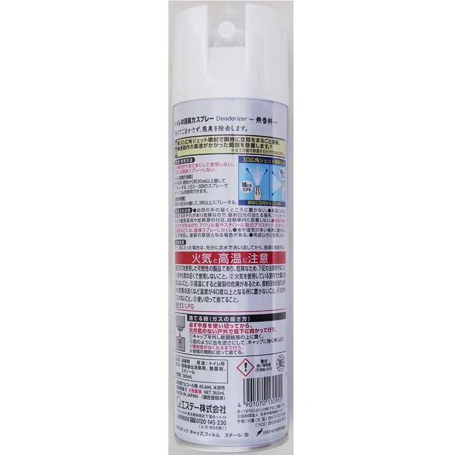 ■商品説明(製品の特徴) ●3D広角ジェット噴射で瞬時に空間をまるごと消臭。●便器内の薬液のかかった範囲を除菌します。※全ての菌を除菌するわけではありません。 【トイレ空間の消臭】壁や天井、便器から約30cm以上離してスプレーする。1日2〜3回スプレーで約1〜1.5ヵ月使用できます。【便器の除菌】便器から約30cm離して、3秒以上スプレーする。■使用上の注意 ●幼児の手の届くところに置かない。●高温になると破裂するおそれがあり危険なので、直射日光の当たる場所、ファンヒーターなどの暖房器具や加熱源の付近、自動車内に放置しない。●変色や傷めるおそれがあるので、アクリル製やスチロール製のプラスチック、白木やニス塗装部などには、直接スプレーしない。●水や湿気の多い場所に置かない。サビが発生し、破裂の原因となる場合がある。●用途以外に使用しない。【応急処置】●万一、目に入った場合は、充分に流水で洗い流してから、医師に相談する。【火気と高温に注意】高圧ガスを使用した可燃性の製品であり、危険なため、下記の注意を守ること。1.炎や火気の近くで使用しないこと。2.火気を使用している室内で大量に使用しないこと。3.高温にすると破裂の危険があるため、直射日光の当たる所や火気等の近くなど温度が51度以上となる所に置かないこと。4.火の中に入れないこと。5.使い切って捨てること。高圧ガス:LPG火気厳禁■成分・分量 植物抽出消臭剤、除菌剤、エタノール■問合せ先 エステー株式会社お客様相談室 電話番号:0120‐145‐230受付時間:月〜金9:00〜17:00迄土・日・祝日・年末年始・夏季休暇を除く)■製造販売会社(メーカー) エステー株式会社■広告文責 株式会社サンドラッグ電話番号:0120‐009‐368■JANコード 4901070130955■ブランド トイレの消臭力スプレー※パッケージ・デザイン等は、予告なしに変更される場合がありますので、予めご了承ください。※お届け地域によっては、表記されている日数よりもお届けにお時間を頂く場合がございます。
