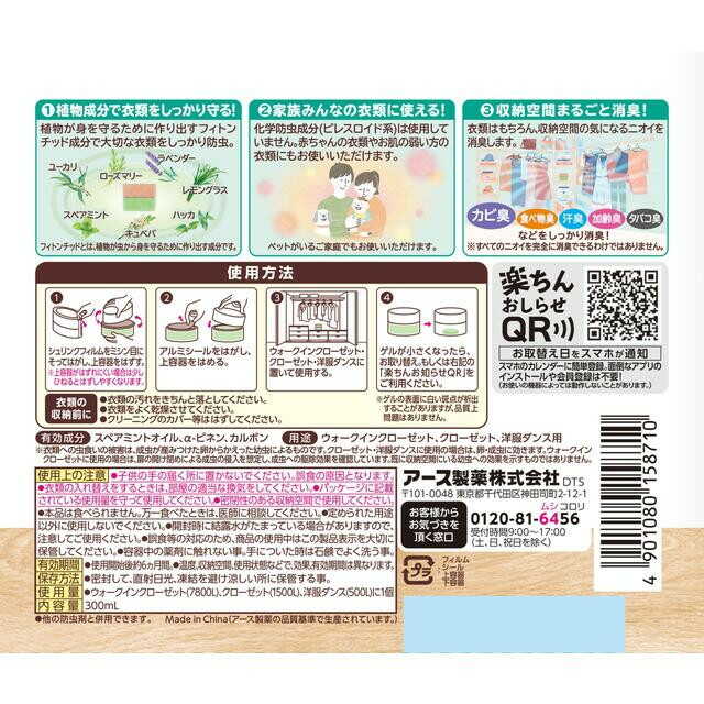 商品説明(製品の特徴)ウォークインクローゼットなどに置くだけで6ヵ月間衣類を守ります。ピレスロイド系化学防虫成分を含まない植物由来成分を配合。使用上の注意●子供の手の届く所に置かないでください。誤食の原因となります。●衣類の入れ替えをするときは、部屋の適当な換気をしてください。●パッケージに記載されている使用量を守って使用してください。●密閉性のある収納空間で使用してください。●本品は食べられません。万一食べたときは、医師に相談してください。●定められた用途以外に使用しないでください。●開封時に結露水がたまっている場合がありますので、注意してご使用ください。●誤食等の対応のため、商品の使用中は製品表示を大切に保管してください。●容器中の薬剤に触れない事。手についた時は石鹸でよく洗う事。○ウォークインクローゼット(7800L)、クローゼット(1500L)、洋服ダンス(500L)に1個成分/分量【有効成分】スペアミントオイル、α-ピネン、カルボン保管及び取扱上の注意●密封して、直射日光、凍結を避け涼しい所に保管する事。問い合わせ先アース製薬株式会社 お客様からお気づきを頂く窓口:0120-81-6456メーカー名(製造販売会社)アース製薬株式会社ブランド名防虫力原産国中国広告文責株式会社サンドラッグ/電話番号:0120-009-368JAN4901080158710 ※パッケージ・デザイン・内容等は、リニューアルにより予告なしに変更される場合がありますので、予めご了承ください。※お届け地域によっては、表記されている日数よりもお届けにお時間を頂く場合がございます。ピレパラアース、ぴれぱらあーす、防虫力、防虫剤、衣類用、洋服用、防虫、ダニ除け、ダニよけ、消臭、防カビ、カビ防止、黄ばみ、防止、予防、対策、ダニ対策