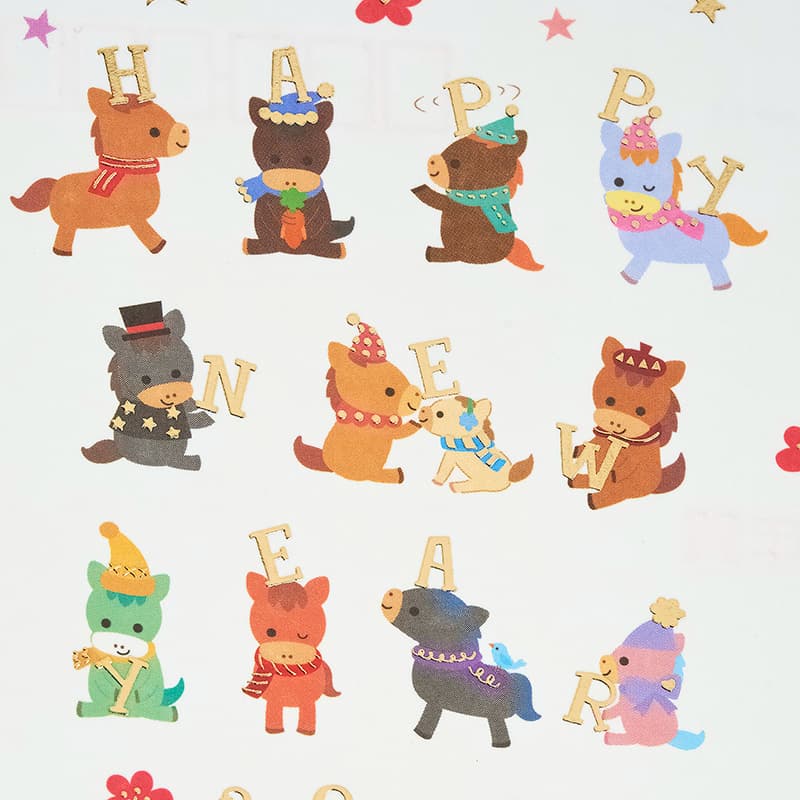いろいろなポーズをしたカラフルなウマたちが、「HAPPY NEW YEAR」のアルファベットを一つずつ持っているキュートなデザインです。 全面に金箔加工がほどこされています。 ●郵送の際は切手をお貼りください。詳しくは日本郵便株式会社Webサイトでご確認ください。 ●3枚入り ●サイズ:約幅10×奥行0.5×高さ14.8cm ●日本製おすすめ特集 ▼当店では在庫管理システムにより複数のオンライン店舗の在庫を共有しております。 ご注文の殺到やアクセス集中により在庫数の更新が間に合わず、実際の在庫と誤差が生じる場合がございます。 商品のご用意が出来ない場合がございますので、その際はメールにて都度、ご連絡差し上げます。 あらかじめご理解・ご了承ください。 ◆大口注文、ご相談ください!◆ 現、在個数以上のご希望数がございましたら、お気軽にお問い合わせください。 メーカー在庫がございましたら対応致します!(セール、値下げ品は除く) 納期:休業日を除く4〜5日 ※商品画像はイメージです。実際とは異なる場合もございます。