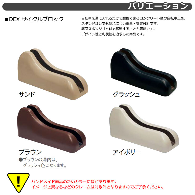 駐車場用品 Dex サイクルブロック 2個セット 自転車を溝に入れるだけでかんたん駐輪できるサイクルスタンド! 販売条件 ◆詳しくはこちらをご確認ください サイズ 本体:W200×D600×H255mm 車輪挿入幅:50mm 32.0kg カラー ・サンド ・グラッシュ ・ブラウン ・アイボリー 仕様 サイクルスタンド(自転車スタンド) ※約幅50mm、径28インチのタイヤまで対応します。側面まで凹凸が突き出したタイヤは入らないことがございます。 材質 コンクリート塗装 セット内容 ■サイクルブロック(2個) ※ご購入時に選択いただいたカラーの商品1点をお送りいたします。 備考・注意 ※配送には実働約5日~10日程度お時間が必要となります。欠品時はお時間が必要な場合がございます。 ※イメージ画像はイメージサンプルとして販売内容以外の商品があります。必ず内容を確認ください。 ※イメージ画像は使用するブラウザにより色が違って見える場合があります。 ※設置場所は安定感を確保するために下が平坦な場所に設置してください。 分類 【駐車場用品】【サイクルガレージ】【ブラック】【ホワイト】【ブラウン】【TOYO】【サイクルブロック】サイクルスタンド Dex サイクルブロック Dex サイクルブロックは設置するだけで日常で使う自転車をさっと使ってさっとしまえる便利なサイクルスタンドです。 重量32kgの置き式としてスタンド無しでも倒れにくい安定設計です。また底面スポンジで移動することもできますので、置き場所を変えることもできます。 デザイン性に優れたサイクルブロック 自転車の前輪をサイクルブロックの溝に入れるだけでかんたんに駐輪できます! 細い車輪でもぐらつかない2重構造でさまざまな自転車に幅広く対応します。 ※約幅50mm、径28インチのタイヤまで対応します。 ※側面まで凹凸が突き出したタイヤは入らないことがございます。 ※重量があるので移動の怪我には十分注意してください。 ※強風時には自転車が倒れることがあります。注意ください。 ●その他の「一流メーカーのサイクルスタンド」も多数取り扱っております! ※未掲載商品をお探しの方はお問い合わせください! 【TOYO】 サイクルブロック 【オンリーワンクラブ】 サイクルピラー Type A(埋設タイプ)、サイクルピラー Type B(固定タイプ) 【カツデン】 D-NA Clip、D-NA Clip-Slim、D-NA Clip壁付け、D-NA DELTA、D-NA Clip、D-NA C、D-NA S、D-NA PM、D-NA S、D-NA PK、D-NA PR、D-NA CESTA、D-NA Liatina、D-NA ButterFly、D-NA Bear、D-NA Elephant、D-NA Bird、サイクルポート K型、サイクルポート T型 【四国化成】 サイクルラック S6型 CLRKS6、サイクルラック S7型 CLRKS7、サイクルラック S4型 CLRKS4-H、サイクルラック S4型 CLRKS4-L、サイクルラック S5型 CLRKS5-H、サイクルラック S5型 CLRKS5-L 【中部コーポレーション】 Cijet YJ-01、Cijet YJ-01KS、Cijet YJ-02、Cijet YJ-02KS、Cijet YJ-03、Cijet YJ-03KS、Cijet YJ-04、Cijet YJ-04KS、Cijet YD-01、Cijet YD-01KS、Cijet YD-02、Cijet YD-02KS、Cijet YP-01、Cijet YP-02、Cijet YC-02 Dex サイクルブロックの仕様 ●置き式です。背面に手がかりがあります。 ●約幅50mm、径28インチのタイヤまで対応します。側面まで凹凸が突き出したタイヤは入らないことがございます。 ●輸入品のため品薄及び欠品になる場合がありますので、納期のご確認をお願いします。 ●製品の特性上、表面に気泡がある場合があります。 ●寒冷地では凍害の恐れがありますのでご注意ください。 ●強風の際には、自転車が倒れる場合がございますので、ご注意ください。 ●製品表面は塗装仕上げですので、衝撃や擦れなどにより欠けたり剥がれたりする恐れがあります。 ●タイヤ痕などの汚れが付着する場合があります。汚れが気になるときは中性洗剤を含ませたやわらかいスポンジなどで取り除いてください。完全に取れない場合もございます。ご理解の上、ご使用ください 他のお勧め自転車スタンドはこちら