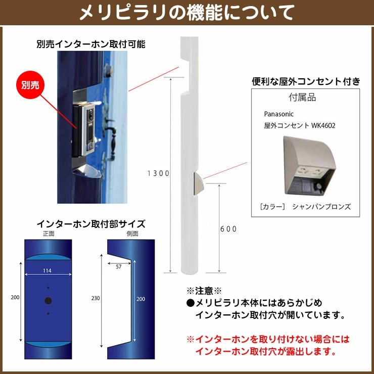 機能ポール メリピラリ(バロ) フィンランドbobi社のトンガリ帽をイメージした大人気ブランドポストのボビシリーズとの相性抜群の機能門柱! 販売条件 ◆詳しくはこちらをご確認ください サイズ 詳細図をご確認ください カラー ・ボルドー ・ダークグリーン ・ネイビーブルー ・レッド ・オリーブ ・ホワイト ・ブラック 仕様 機能ポール(インターホンスペース/外部用コンセント付き) 照明:マリンランプ(グローブ:乳白色/ランプ:LEDユニット5W) ※インターホンの取付には現地加工が必要です。 ※インターホンは別途市販品をご用意し、お取付けください。必ず詳細図でサイズをご確認ください。 材質 スチール/真鍮 セット内容 ■機能ポール:メリピラリ ■照明:バロ(メリピラリと同色) ※ご購入時に選択いただいたカラーの商品1点をお送りいたします。 備考・注意 ※配送には実働約3日~5日程度お時間がかかる場合があります。欠品時はさらにお時間がかかる場合があります。 ※イメージ画像はイメージサンプルとして販売内容以外の商品があります。必ず内容を確認ください。 ※イメージ画像は使用するモニターやブラウザにより色が違って見える場合があります。 ※インターホンや照明の取付には配線工事が必要です。あらかじめ電気工事店と打ち合わせを行ってください。 ※施工には、専門的な知識と、道具、技能が必要となります。お近くの工事店 (例:外構をした会社)にて設置を依頼して頂くようお願い致します。 適合商品 ◆メリシリーズ専用オプション商品紹介◆ ●メリピラリ専用表札プレート ※オプション商品は別売です。必要に応じてご用意ください。 分類 【セキスイデザインワークス】【門柱 機能ポール】【2点セット】【ナチュラルモダン】【ホワイト】【ブルー】【レッド】【グリーン】【ブラック】 ◆メーカー希望小売価格はメーカーカタログに基づいて掲載していますSEKISUI DESIGN WORKS(セキスイデザインワークス) 郵便ポスト メリシリーズ セキスイデザインワークス(旧名:セキスイエクステリア)のメリピラリは、大人気のボビシリーズと相性抜群の丸い柱を軸に、真鍮製のマリンランプを組み合わせた機能門柱で、便利にボビポストの魅力を引き上げます。 ボビとは?※上記設置イメージは宅配ボックス+郵便ポストの機能を搭載した「ボビカーゴ」です。 フィンランドの人気ポストメーカー「bobi社」から輸入した大人気のポストシリーズです! ボビシリーズの特徴「長方形に半円を加えた特徴的なフォルム」は、ふんわりと丸く積もった雪からヒントを得ています。 ●その他の「一流メーカーポスト」も多数取り扱っております! ※未掲載商品をお探しの方はお問い合わせください! 【ユニソン】 クルムII・コルディア・ケイト・リピットDB・フロリア・バロ・グリートII・ピアット・ボルサ・テラII・プラスト・ヴィコDB・ヴィコWH・ヴィコBI・アンテ・ラディ・ヴィルク・イオス・ルージュ・コラーナ・オスト・リーダ・ベリエ・ロワール・クティ 【YKKap】 ルシアス 宅配ボックス・ポスティモ 宅配ボックス・独立型ポスト フィッテ・ポスティモ・G3型・G4型・エクステリアポスト T4型・T5型・T6B型・T9型・T9R型・T9L型・T10型・T11型・T12型・T13型・T14型・プリュード ポスト・FX01型・FX02型・FX03型・Jポスト・HS1型・BA14型・ 【三協アルミ】 SWE型・SWC型・JWHP型・SMA型・SWM-S型・SWD型・STS-1N型・STS-2N型・KA型・BA型・HA型・HS型・OS型・SON型・SOV型・SOR型・SKU型 【LIXIL / リクシル】 宅配ボックスKT・宅配ボックスKL・スマート宅配ポスト・ネクストポスト L-1型・エクスポスト グレイス・FS・ヴェール・ハングス・プレイン・フラット横型ポスト・アクシィ横型ポスト・セキュリティ縦型ポスト・フラット縦型ポスト・スリム縦型ポスト・縦型ポスト・箱型タイプ・口金タイプ・アメリカンポスト・アメリカンタイプ・TOEXポスト 【オンリーワン クラブ エクステリア】 ハイビポスト・グランスタンド・オーパス クール・パーサス ネオ・ジョイ・クラッシー スクエア・クーリエ・和の文・ナミプラス アール・ソルベ・ブランシェット プラス・アイル・ノイエファイン ウッド・ノイエキューブ・ライク・ティンバー・モリビア・カーブス・ソニック・ゼラフィーニ・イルヴァリオ グレイン・クレール ヌーヴォ・ボーノ レボ・トーン・ティーポ グレイン・ファン セイル・ディーポスト・フィールII・ノーラン・マカロン・ミルク・カヌレ・テディ・メリィ・アルコ・ポスタ プラスII 【セキスイデザインワークス】 Bobi(ボビ)・BonBobi(ボンボビ)・BobiCargo(ボビカーゴ)・bobiround(ボビラウンド)・メリピラリ・Moominbobi(ムーミンボビ)・オスロ・ノボックス・ティンブク・ボン・キョウト・シェルプール・トウキョウ・ベガス・ディープノブロック・マックスノブロック・メンフィス・ビバリー・ダニング・エリカデザインライン・フラボックス・レターボックスマン 【パナソニック エクステリア】 サインポスト・小包ポスト パケ