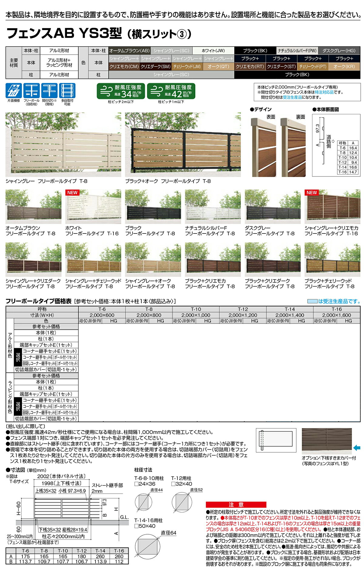 フェンス LIXIL フェンスAB YS3型 H1200タイプ(T-12サイズ) ポールのみ フェンスAB YS3型 専用ポールです 販売条件 ◆詳しくはこちらをご確認ください サイズ 長さ:1380mm(施工時GLからH1200mm+埋込180mm) 幅:32×40mm カラー ・ABオータムブラウン ・SCシャイングレー ・JWホワイト(アイボリーホワイト) ・BKブラック ・PWナチュラルシルバーF 仕様 ポール:自在柱(耐風圧強度34m/秒相当)/ストレート継手付属 材質 アルミ形材 セット内容 ■フェンスAB YS3型 H1200サイズ(T-12) ポール「柱(1本)」 ※購入時に選択したカラーの商品をご用意いたします。 備考・注意 ※ご使用にはフェンス本体が別途必要になります。 ※配送には実働約2日~5日程度お時間が必要となる場合があります。お急ぎの方はお問い合わせください。 ※イメージ画像はイメージサンプルとして販売内容以外の商品があります。必ず内容を確認ください。 ※イメージ画像は使用するモニターやブラウザにより色が違って見える場合があります。 ※詳しい購入方法は画像をご確認ください。その他ご不明な点がありましたらお問い合わせください。 ※施工には、専門的な知識と、道具、技能が必要となります。お近くの工事店 (例:外構をした会社)にて設置を依頼して頂くようお願い致します。 適合商品 ◆適合商品紹介◆ ●フェンスAB YS3型 H1200サイズ(T-12) 分類 【LIXILフェンス】【OP部品】【FAB-YS3】【H1200】【オータムブラウン】【シャイングレー】【ホワイト】【アイボリーホワイト】【ブラック】【ナチュラルシルバーF】【フェンスABシリーズ】LIXIL フェンスABシリーズ 「選びやすい」「使いやすい」「拾い出しがしやすい」LIXILのフェンスABは3つの“しやすい”を実現し、見た目にも配慮した美しいデザインのフェンスです。 ●その他の「一流メーカーフェンス」も多数取り扱っております! ※未掲載商品をお探しの方はお問い合わせください! 【LIXIL】 アルミ形材フェンス・サニーブリーズ・フェンスAA・フェンスAB・アルメッシュ・ハイミレーヌR・ハイスクリーン・ハイサモア・アルミサモア・アルミトンガ・アメリカン・防音フェンス・すやや・ルーバーフェンス・スクリーン・プログコート・スリットライン・アルミ鋳物フェンス・ディズニー・和風生垣フェンス・木樹脂フェンス・グリッド・ハイグリッド・メッシュフェンス・エコリス・グリップライン 【YKKap】 リレーリア・ルシアス・シンプレオ・スクリーンフェンス・レスティン・形材フェンス・鋳物フェンス・シャローネ・トラディシオン・リウッド・イーネット・竹垣風フェンス 【三協アルミ】 形材フェンス・フィオーレ・エルファード・モンブレム・ニュービラフェース・フレイナ・エクモアX・エクモアZ・シャトレナ・カムフィX・ニューアイシャノン・ニュータウンリード・スーパー速川・ルミレス・ララミー・比美・速川・福光・大和塀・ニューアイシャノンG・ニューカムフィハイタイプ・ガーデンスクリーン・ベルサード・エルファード・J・モダン・鋳物フェンス・木粉入り樹脂フェンス・樹脂竹垣・スチールメッシュフェンス・ユメッシュE・ユメッシュHR・ユメッシュZ・ユメッシュR・ユメッシュG・PYD-S・PYM-S・セレクティ・マイエリアII・ロンバス・都雅 【四国化成】 木調フェンス・アレグリア・ハイパーテーション・クラリス・アルディ・ルリエフ・クレディSG・クレディ・バリュー・ルーバーフェンス・ルーバーK・格子フェンス・格子K・マイ・テネシー・ライン・ロートアルミフェンス・ガーデンフローラ・鋳物フェンス・スクリーンフェンス・竹垣・FDフェンス・エルパーテーション・和・大型フェンス・大型メッシュフェンス・グリーンシェード・パーテーション ■ 下記の拾い出し方法を参考に下から必要な商品をクリックして専用ページよりご購入ください! ▲ 上記オプション商品について ●コーナー部品(コーナーの連結施工時に1セット必要) コーナー部を連結するだけでなく、コーナー部のすき間を隠す目隠しタイプもございます。 ●下桟すきまカバー(フェンス下目隠し施工時のフェンス1枚につき、1枚必要) フェンス下のすき間を隠すことが出来る追加部材です。必要に応じてご用意ください。 ※「下桟すきまカバー本体(コーナー部はコーナー用本体)」の購入時には、「カバー本体枚数と同数の取付部品」、「カバー端部1対ごとに、端部キャップが1セット」必要です。また、「コーナー部1カ所につき、端部キャップが1セット」必要です。 ●コーナー1箇所を含むフェンス3枚1連結施工時の拾い出し例 【下桟すきまカバー本体:1枚】+【下桟すきまカバー本体コーナー用:2枚】+【取付部品:3セット】+【端部キャップ:2セット】必要 ●端部カバー(フェンス本体の切詰使用時に1セット必要) フェンス本体を切り詰めて使用する際に1セット必要です。 フェンス本体を2枚に切り分けて使用する際には2セット必要です。 ●多段柱用ストレート継手(多段柱施工時のフェンス連結1箇所につき、1セット必要) 