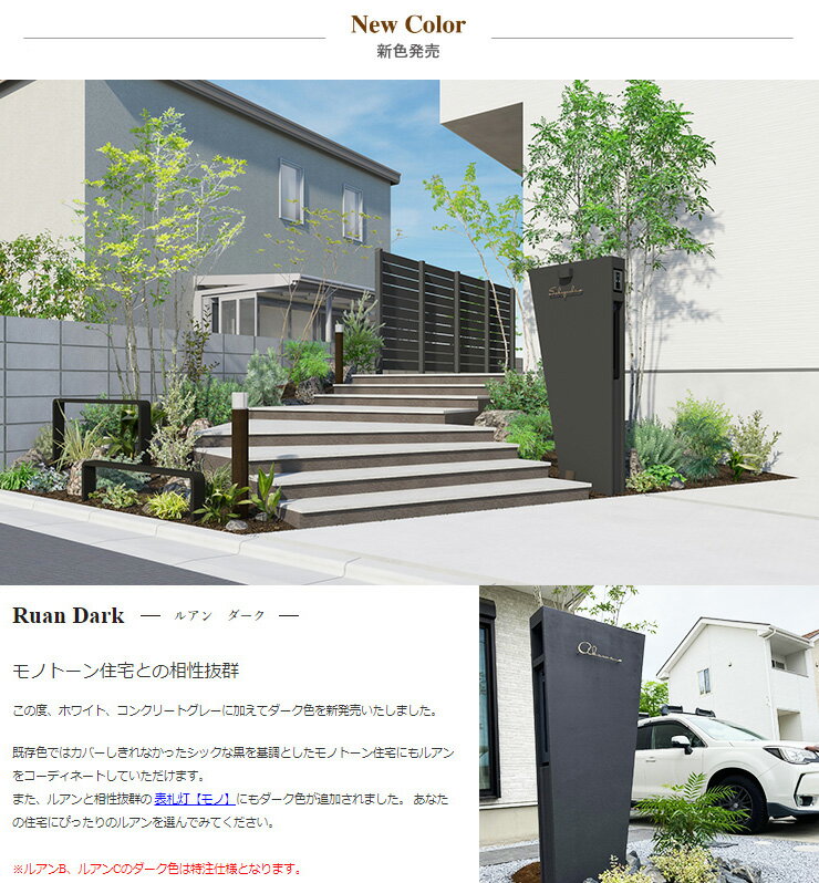 門柱 ポスト おしゃれ ルアンA ポストあり 照明無し 【ディーズガーデン正規特約店】 販売条件 ◆詳しくはこちらをご確認ください カラー ・コンクリートグレー サイズ W650×H1600×D160mm 約21kg 材質基材:EPS発泡樹脂、構成材:ガラスメッシュ、モルタル、塗材、防汚コート 仕様※インターホン別売 ※表札別売 ※機能門柱(照明無し) セット内容 ■ルアンA ポストあり 照明無し ※お選び頂いた仕様の商品をお送りいたします。 備考・注意 ※配送には実働5日~7日程度で出荷となります。注文状況によりお時間が必要になる場合があります。 ※商品の取り付け方法については施工方法を参考に、施工場所にあった取り付けを行ってください。 ※イメージ画像はイメージサンプルとして販売内容以外の商品があります。必ず内容を確認ください。 ※イメージ画像は使用するモニターやブラウザにより色が違って見える場合があります。 ※施工には、専門的な知識と、道具、技能が必要となります。お近くの工事店 (例:外構をした会社)にて設置を依頼して頂くようお願い致します。 分類 【ディーズガーデン】【郵便ポスト・郵便受け】【機能門柱】【機能ポール】【戸建向け】当店おすすめ! ディーズガーデン 機能門柱 Ruan ルアン シリーズ ルアンは普通の機能門柱では満足できないあなたへ送るスタイリッシュな機能門柱(デザインウォール)です。個性的な形でもシンプルな見た目なので周りの植栽やアイテムの雰囲気を壊さずおしゃれな外構が実現できます。見慣れないけど心地よい。あったらいいなを形にしました。 ●その他の「一流メーカー門柱」も多数取り扱っております! ※未掲載商品をお探しの方はお問い合わせください! 【LIXIL】 機能門柱FW・ファンクションユニット アクシィ1型 アクシィ2型 デザイナーズパーツ仕様・ルミフェイス・ウィルモダン 門柱仕様・ウィルモダンスリム・ヴェールファンクション スリムタイプ・ヴェールファンクション ワイドタイプ・アーキキャストファンクション・スクリーンファンクションユニット・スリムスクエア ユニット型・ハングスファンクション・ユーロブリーズ・ディズニー ファンクションポール・テグランNeo W05 W08 W20・テグラン 門袖C型・ウォールスクリーンファンクション門袖・有孔ブロックウォール 【YKKap】 ルシアス ウォール NA01型 NB01型 NC01型 RH01型 RH02型 HH02型 HH03型 NH01型 NH02型 NH03型 PH01型 BE01型 RE01型 RE02型 HE02型 HE03型 NE01型 NE02型 NE03型 PE01型 WD01型 WD02型 SD01型 HF01型 ・ルシアス サインポール A01型 A02型 A03型 B01型・ルシアス ポストユニット WA01型 WB01型 WC01型 WD01型 WE01型 SA01型 SB01型 SC01型 SD01型 SE01型 SA02型 SB02型 SC02型 SD02型 SE02型 KA01型 KB01型 KC01型 KD01型 KE01型 PA01型 PB01型 PC01型 PD01型 PE01型 CA01型 CB01型 CC01型 CD01型 CE01型 HC01型 HD01型 HE01型 HA01型 HB01型 HH02型 HD02型 HE02型 HD03型 ルシアス宅配ボックス1型 ルシアス宅配ポスト2型 ポスティモ宅配ボックス1型 シンプレオ宅配ボックス2型・ルシアス 機能門柱 A01型 B01型 独立仕様 門柱仕様・エレポルト 機能門柱1型 独立仕様 門柱仕様・カスタマイズ ポストユニット・シャローネ ポストユニット S01型 S02型 S03型 S04型 S05型・シャローネ 機能門柱1型 サンドブラスト1型 独立仕様・シャローネ 機能門柱2型・スタンダード ポストユニット 3型・シンプレオ ポストユニット 1型・ポスティモα3 ポスティモαIII C型 D型・ルシアス アクセントポール 1型・ルシアス スリムアクセントポール 1型 【三協アルミ】 機能ポール・フレムス Light・スララ・ステイム Aタイプ AJタイプ・セレージュ・モデアII・スリムモダン・フレムス・ジアル 1型 2N型 3型・マクリズムP・クルポ・ファノーバ・コレット・エスポ 1型 2型 3型・エレニー・機能門柱・アクセンティア・マクリズムM 【四国化成】 機能門柱・ファミーユ1型・アルディ門柱 宅配ボックス付・アートウォール門柱 S1型 W1型・アートウォール門柱ユニット Aタイプ Bタイプ Cタイプ Dタイプ Eタイプ・パレット門柱 T1型 P1型・マイ門柱 SI型 2型 3型 4型・クレディ門柱 1型 2型 3型・ブルーム門柱 M1型 M2型 M3型 S1型 S2型 P1型 P2型 【Panasonic】 エントランスポール アーキフレーム ▼ 当店おすすめ! ディーズガーデン 機能門柱 Ruan ルアン シリーズ ▼ 当店の人気商品Pick Up!