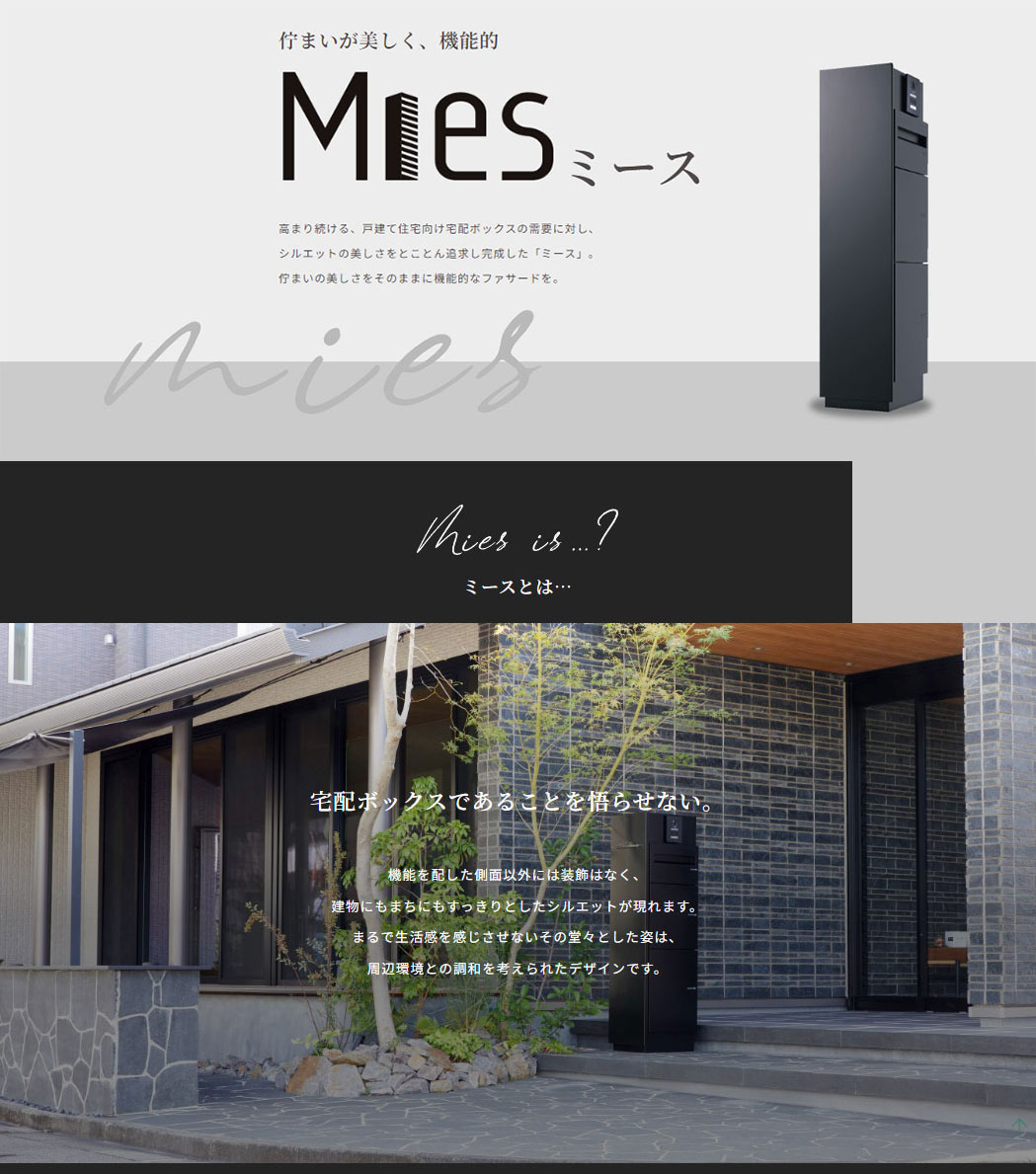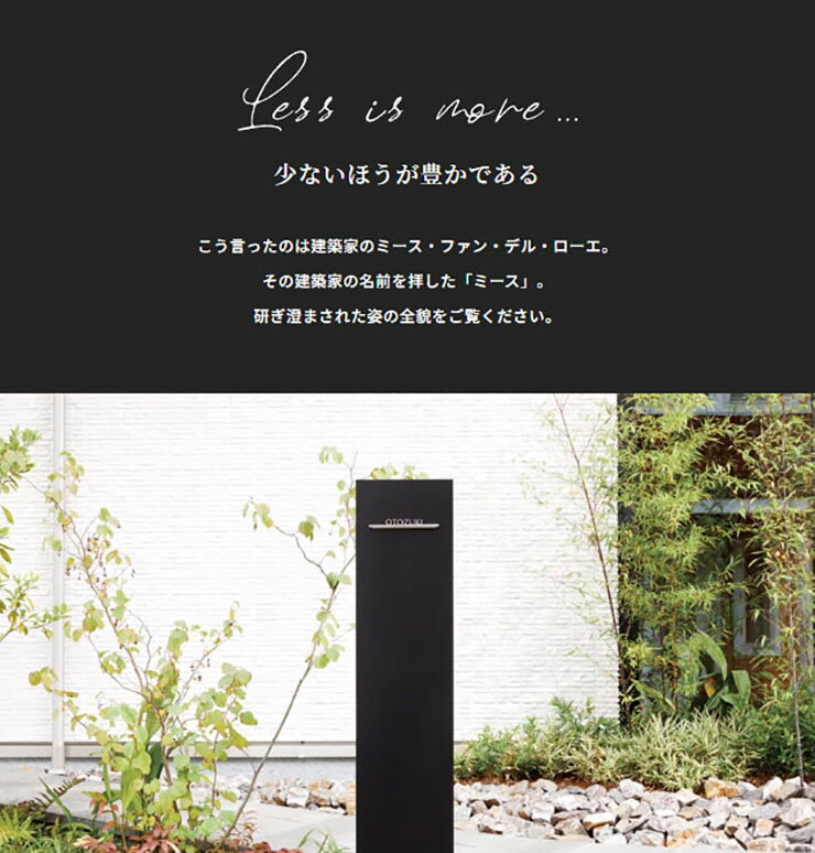 機能門柱 機能ポールMies ミース アンカー仕様 インターホン対応有り シルエットの美しさをとことん追求 販売条件 ◆詳しくはこちらをご確認ください サイズ 画像をご確認ください カラー 画像をご確認ください 仕様 機能門柱 / 郵便ポスト / 宅配ボックス100 / 宅配ボックス110 / シリンダー錠搭載/ インターホン別売・表札付属 ※書体は書体一覧よりご確認ください ※こちらの商品には専用のトランス、ケーブルが必要となります。関連商品からお選びください。 材質 本体:スチール(塗装仕上げ)正面パネル:アルミ(塗装仕上げ) セット内容 ■ステンレス 表札 ライティングサイン ビーム イル L250 BEAM ILL 12V LED照明付き(トランス別売)■ミース アンカー仕様 インターホン対応有り [1]開きタイプカラー:[2] ※[1]には開き方向が入ります ※[2]にはカラーが入ります ※ご購入時に選択いただいたカラーの商品1点をお送りいたします。 備考・注意 ※レイアウト確定後、10日~14日程度で出荷となります。注文状況によりお時間が必要になる場合があります。 ※納品の際は、必ずお立合いの上、荷下ろしのお手伝いをお願い致します。 ※印鑑は現地手配となります。 ※イメージ画像はイメージサンプルとして販売内容以外の商品があります。必ず内容を確認ください。 ※イメージ画像は使用するモニターやブラウザにより色が違って見える場合があります。 ※施工には、専門的な知識と、道具、技能が必要となります。お近くの工事店(例:外構をした会社)にて設置をご依頼して頂くようお願い致します。 分類 【機能門柱】【郵便ポスト】【宅配ボックス】【デリバリーボックス】【シンプル】【モダン】【2WAY】【複数投函】【大容量】【Mies】【ミース】【ユニソン】当店おすすめ! ユニソン 機能門柱 ミース シリーズ 高まり続ける戸建て住宅向け宅配ボックスの需要に対して、シルエットの美しさをとことん追求し完成した「ミース」。 「宅配ボックスであることを悟らせない」をテーマに、機能を配した側面以外に装飾は無く建物にもまちにもスッキリとしたシルエットが現れます。まるで生活感を感じさせないその堂々とした姿は周辺環境との調和を考えられたデザインで佇まいの美しさをそのままに機能的なファサードを演出します。 ●その他の「一流メーカー宅配ボックス」も多数取り扱っております! ※未掲載商品をお探しの方はお問い合わせください! 【ユニソン】 ヴィコDB・ケイト・コルディア・コルディアラック・フロリア・リピットDB 【LIXIL リクシル】 宅配ボックスKT・宅配ボックスKL・スマート宅配ポストTA型・スマート宅配ポストTB型 【YKKap】 ピタットkeyシステムルシアス 宅配ボックス1型・ルシアス 宅配ポスト1型・ルシアス 宅配ポスト2型・シンプレオシリーズ ポスティモ 宅配ボックス1型 【三協アルミ】 フレムス Light S型・フレムス 【オンリーワン クラブ】 デポ・コロン・ヴェリータエボルタ ネロ・ガレット・マカロン・フォルン・エンティガ・キャス・ヴェリータ NX・ポスト&宅配ボックス カレ・カーメル ブロスII・ラウム・コール・スタッフII・スタッフI 【セキスイ エクステリア】 bobi Cargo(ボビカーゴ)・ドゥオモ・ed-CUBE・ノボックス・S.P.B 【パナソニック Panasonic】 エントランスポール アーキフレーム・コンボ・コンボライト・コンボイント・コンボエフ・コンボメゾン・イーコンボライト・コンボフラット 【Brizebox ブライズボックス】 スタンダード・ラージ・EXラージ 【ナスタ Nasta】 プチ宅・プチ宅・REGULAR・KS-TLT450・KS-TLT240・KS-ATSB002・KS-TLU160・KS-TLT340-FN415・KS-TL01R・KS-TL01RC・KS-TLP28・KS-TLP36・KS-TLT340-F 【KGY工業】 KGY・リシムワイド・THB-276・THB-276DW・THB-3115・THB-382・THB-3DanE・リシムユニットE・One・THB-181・リシム コトン・THB-258N 【ダイケン】 TBX-F1・TBX-F2・TBX-F・TBX-G・TBX-G1・TBX-G2・TBX-D・TBX-BDシリーズ 【神栄ホームクリエイト】 CBX-401・CBX-701・CBX-301・CBX-601・CBX-102・CBX-202・CBX-103 ユニソン 機能門柱 ミース シリーズ 一覧からお選びいただけます 当店の人気商品Pick Up!