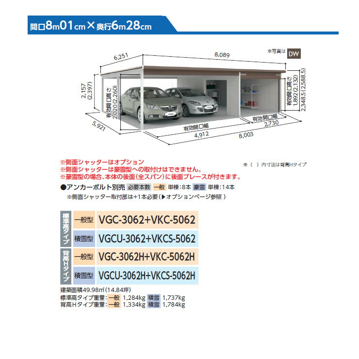 ヨドガレージ ラヴィージュ3 オープンスペース連結型 VGC-3062H+VKC-5062H 一般型 背高Hタイプ 車庫 シャッター ガレージ 自動車 バイク 自転車 倉庫 おしゃれ シンプル 戸建て 庭 かわいい 大容量 大型 敷地に合わせて使い勝手がいろいろ! 販売条件 ◆詳しくはこちらをご確認ください メーカー名 ヨドコウ シリーズ名 ラヴィージュ3 オープンスペース連結 サイズ 幅 8,089mm × 奥行き 6,601.5mm × 高さ 2,588mm 素材 オープンスペース付き 坪数 14.84 重量(kg) 1334 タイプ スチール 対応タイプ 3台用 積雪強度 一般型 天井・屋根仕様 標準屋根 1.メンテナンスピット。2.農業倉庫、作業スペースとして。3.使い勝手の良い便利なオプションも充実。4.シャッターにはディンプル錠を採用=安心の仕様。5.シャッター本体にガルバリウム鋼板、水切りにはアルミを採用=長持ち。当店では商品の施工組立工事は行っておりません、商品の販売のみとなりますのでご注意下さい。大型商品の為、納期が1ヶ月以上掛かる場合がございますのでご注文前に必ず納期をご確認ください。メーカー手配の4トントラックでの大型商品専用配送となり、複数名の荷受けが必要となります、お届け住所によっては販売出来ない場合もございますのでご了承ください。※メーカーカタログ記載のオプション商品は、全て別売りとなります。 セット内容 ■ヨドガレージ ラヴィージュ3 オープンスペース連結型 VGC-3062H+VKC-5062H 一般型 背高Hタイプ 備考・注意 ※商品画像は使用サンプルとして販売内容以外の商品を含む場合があります。必ず内容をご確認ください。 ※商品画像は使用するモニターやブラウザにより色が違って見える場合があります。 ※ご自身での施工・設置が難しいと判断される場合は、お近くの工事店 (例:外構をした会社)にて設置を依頼して頂くようお願い致します。ヨドコウ ヨドガレージ ラヴィージュIII ガレージをもっと楽しもう! 多彩なカラー! 家のトーンに合わせデザインも選べます。 使い方は自由自在! ライフスタイルに合わせたガレージがつくれます 丈夫で長持ち! 耐久性・耐食性に優れ、いつまでも美しい外観です。 ●その他の「一流メーカー物置」も多数取り扱っております! ※未掲載商品をお探しの方はお問い合わせください! 【イナバ物置】 シンプリーシリーズ 【ダイケン】 DM-Zシリーズ・DM-GYシリーズ 【タクボ物置】 Mr.ストックマンダンディ・グランプレステージドアーズ、Mrストックマンダンディ、Mrシャッターマン、バイクシャッターマン 【ヨドコウ】 エスモシリーズ・エルモシリーズ ▼ ヨドガレージ ラヴィージュIII オープンスペース型・ユーティリティスペース型 一覧はこちら