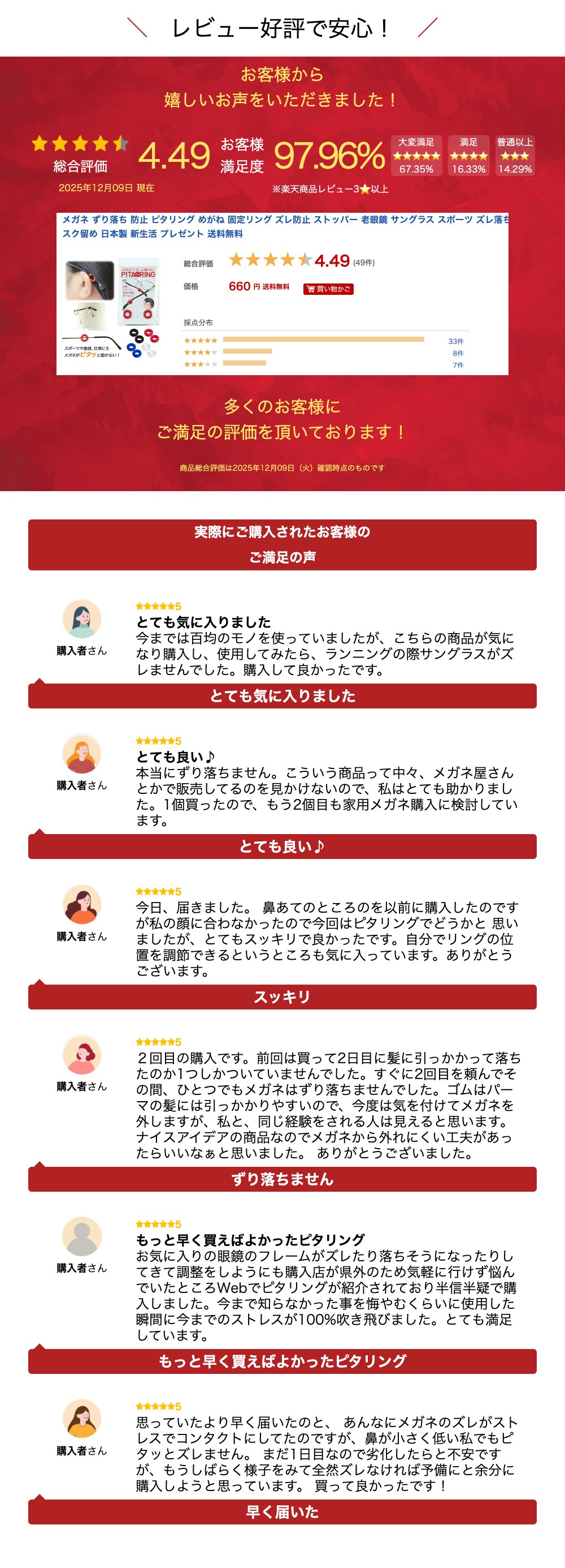 ピタリング《ポイント》スポーツや勉強、仕事にもメガネがピタッと動かない!メガネフレームなどに取り付けてフレームのズレを軽減させます。・メガネのツルにリングを装着し、眼鏡がずれないようにするためのリングです。・眼鏡がすぐにずれてしまう方や、スポーツをする時などに「ピタッ」とフィットして、ぐらつきを防止します。・ピタリングはブラック、クリア、レッド、ブルーの4色展開。使用方法:フレームへの取り付けは至って簡単。メガネのつるの後ろから入れて、ご自由な位置で固定してご利用下さい。弱・中・強と三段階の調節が可能です。《商品説明》テンプル取付許容範囲:幅10mm以下、厚み6mm以下パッケージサイズ:W71×H128mm重量(パッケージ含む):約5g《補足情報》原産国:日本■マスク留めとしてもご使用できます!使用方法:ピタリングの穴の前方部分だけをテンプルに通し、後方部分にマスクを引っかけます。耳よりも前・後ろどちらでも対応可能です。商品について取寄せ商品(2〜3営業日以内の発送)関連商品メガネストラップ マスクストラップ 首かけ ギンガムチェック リボン ...メガネストラップ グラスコード 調整可能 2WAYタイプ メンズ レデ...メガネ 曇り止め くもり止め ジェル 強力 眼鏡 強力ジェル 5g ハ...660円825円660円メガネチェーン メガネストラップ おしゃれ 眼鏡 ストラップ エスニッ...メガネストラップ メガネチェーン 首掛け おしゃれ レディース メンズ...メガネストラップ 眼鏡ストラップ グラスコード 本革 牛革 レザー シ...770円1,100円1,540円メガネケース シューズ型 おしゃれ 可愛い かっこいい 子供用 キッズ...メガネケース 眼鏡ケース おしゃれ 大人 折りたたみ 折畳式 スリム ...メガネケース ハード おしゃれ 眼鏡ケース 老眼鏡ケース サングラスケ...1,000円1,100円1,320円メガネケース かわいい おしゃれ 眼鏡ケース 市松模様 チェック柄 カ...メガネケース ハード 眼鏡ケース サングラスケース おしゃれ コンパク...メガネケース ハード おしゃれ 大人 かわいい 眼鏡ケース 花柄 北欧...1,144円1,210円1,485円商品詳細 ピタリング 《ポイント》 スポーツや勉強、仕事にもメガネがピタッと動かない! メガネフレームなどに取り付けてフレームのズレを軽減させます。 ・メガネのツルにリングを装着し、眼鏡がずれないようにするためのリングです。 ・眼鏡がすぐにずれてしまう方や、スポーツをする時などに「ピタッ」とフィットして、ぐらつきを防止します。 ・ピタリングはブラック、クリア、レッド、ブルーの4色展開。 使用方法: フレームへの取り付けは至って簡単。メガネのつるの後ろから入れて、ご自由な位置 で固定してご利用下さい。 弱・中・強と三段階の調節が可能です。 《商品説明》 テンプル取付許容範囲: 幅10mm以下、厚み6mm以下 パッケージサイズ:W71×H128mm 重量(パッケージ含む):約5g 《補足情報》 原産国:日本 ■マスク留めとしてもご使用できます! 使用方法: ピタリングの穴の前方部分だけをテンプルに通し、後方部分にマスクを引っかけます。 耳よりも前・後ろどちらでも対応可能です。 商品について 取寄せ商品(2〜3営業日以内の発送) 取寄せ商品につき、ご注文のタイミングによりまして、欠品でご用意できない場合もございます。 あらかじめご了承のほど、お願いいたします。