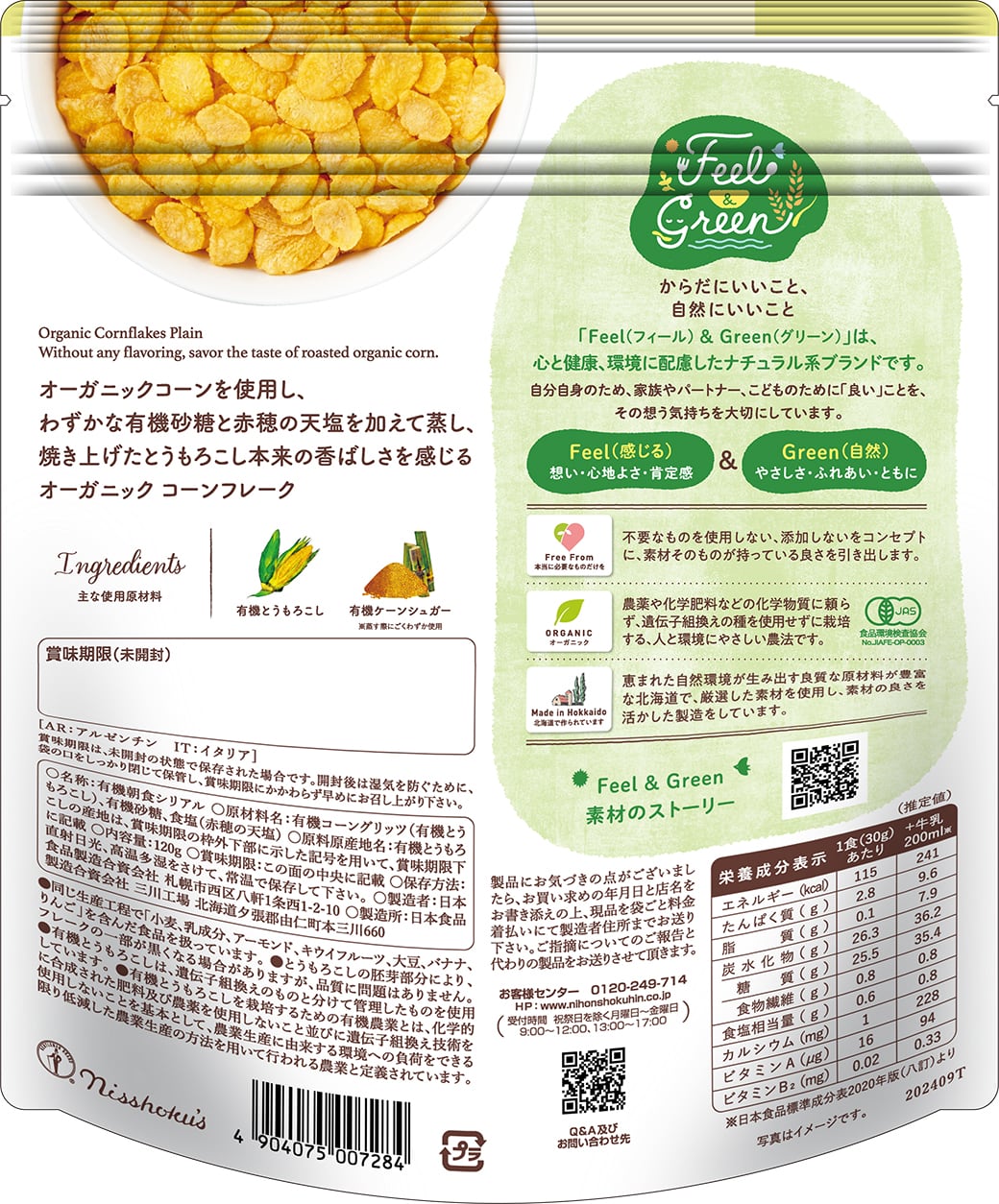 日食 Feel&Green やさしいコーンフレーク プレーン 120g×4袋 オーガニック オーガニックコーンフレーク 北海道