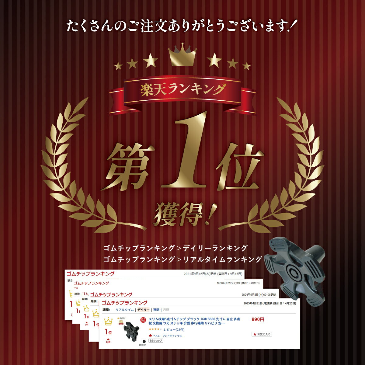 サイズ内径:16mm、外径:27mm、接地面:115mm重量221gカラーバリエーションブラック個数1個スリム杖用5点ゴムチップ 16Φスリム 直径16Φの杖に対応した先ゴム \ 楽天ランキング1位 /ゴムチップランキング 5点の接地面で自立式に! 一本杖の先ゴムを5点の先ゴムに付け替えることで、自立式の杖に早変わり! 接地範囲が広がり安定感も増すため、1点では歩行が不安な方にもオススメ! ※傾斜のある不安定な場所や強い振動が与えられると自立しません。 5点の接地面で支える安定感のある先ゴムです。先ゴムの消耗を放っておくのは大変危険です。カラダの重心が偏り、姿勢を悪くしてしまう可能性や、転倒や事故に繋がる恐れがございます。擦り減っていると感じたら、交換をオススメします。 カラーバリエーション ブラック ご購入前にサイズのご確認をお願いします。 内径:16mm、外径:27mm、接地面:115mm 当店取り扱いの一本杖はこちら! 【杖/歩行補助のオプション商品の送料について】 当店取り扱いの杖(送料無料商品)とご一緒にご注文いただけますと、一つの梱包箱に入れて発送をさせていただけるので、同配送先の場合は送料無料となります。 ※沖縄・離島等一部地域への発送の場合は、追加送料が発生いたします。 こちらのゴムチップに合う16Φの杖をご用意しております。 杖/歩行補助のオプション品をご用意しております。 対応地域は以下の通りです。 東京都・神奈川県・埼玉県・千葉県・茨城県・栃木県・群馬県・富山県・石川県・福井県・新潟県・長野県・山梨県・愛知県・岐阜県・静岡県・三重県・大阪府・兵庫県・京都府・滋賀県・奈良県・和歌山県・鳥取県・島根県・岡山県・広島県 ※対応地域でも離島等、一部地域は対応外となります。その他の地域に関しましては通常出荷・お届けとなります。※交通事情や悪天候、自然災害の影響などにより、対応地域に関しましても翌日にお届けが出来ない場合がございます。