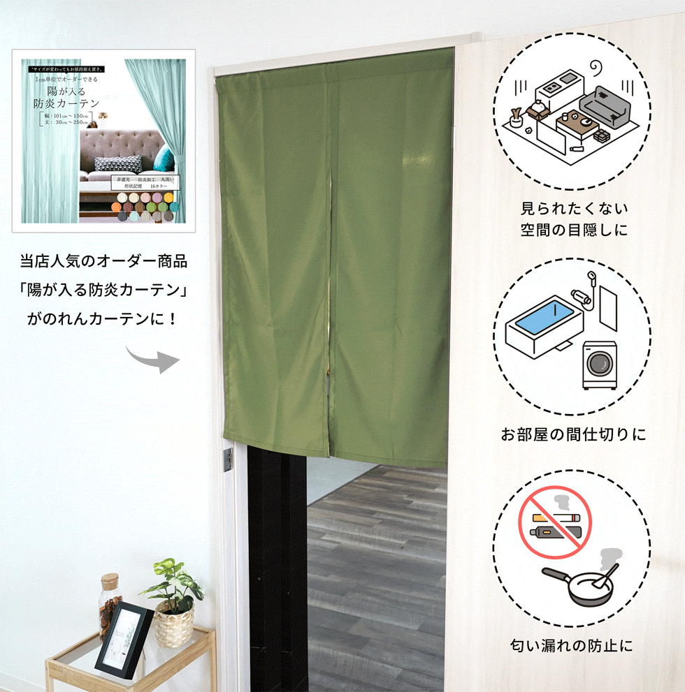 イージーオーダー 非遮光 防炎のれんカーテン サイズ オーダーのれん【1cm単位から選べる】幅:40cm〜130cm 丈: 30cm〜200cm※通し穴はポールの直径2.5cmまで対応 スペック 非遮光、防炎(防炎性能試験合格)、洗濯可能、無地 カラー ホワイト、アイボリー、イエロー、ピンク、パープル、ワイン、オレンジ、ブラウン、モスグリーン、ブルー、ターコイズブルー、ネイビー、ライトグレー、ダークグレー、ブラック 計15カラー 生産 / 素材 日本製 / ポリエステル 100% 洗濯表示 ※洗濯ネットに入れて洗ってください。※アイロンをかける際は、あて布を使用してください。 オーダー商品の注意点 受注生産のオーダー商品となります。オーダーサイズ製品に関しましては、ご注文後のキャンセル及び、お客様の寸法ミス、良品でも返品ができませんので、あらかじめご了承下さいませ。 商品用途 オーダーのれん, オーダー暖簾, オーダーカーテン, イージーオーダー, 暖簾, のれん, 間仕切り, 目隠し, パーテーション, カーテン, インテリア, 収納, 玄関, 出入り口, 遮光, 防炎, 防炎性能試験合格, 洗える, 洗濯可能, ウォッシャブル, 丸洗い, シンプル, 無地, 送料無料, 子供部屋, 子ども部屋, 寝室, ベッドルーム, 居間, リビング, キッチン, 台所, ダイニング, オフィス, 会社, 事務所, 保育園, 幼稚園, 学校, 病院, ホテル, 宿泊施設, 公共施設, 温泉, シンプル, 日本製衝撃価格!1cm単位でオーダーできる! 非遮光なのに防炎!陽が入るのれんカーテン〔 幅 40cm〜130cm、丈 30cm〜200cm 〕 【 オーダーサイズ、陽が入る、防炎加工、洗濯可能、選べる15カラー 】 当店人気商品「陽が入る 防炎オーダーカーテン」。そのオーダーカーテンが、機能はそのまま「のれんカーテン」に大変身!お家で過ごす時間が多くなった今、お部屋にいながら少しでも多くの光を取り入れて生活する方法がないものか...とお考えのあなたには、機能性も充実しているこちらの「防炎非遮光のれん」がおすすめです。 程よく光を取り込んでくれる非遮光のれんは、お部屋を明るくしてくれて、開放感もアップ。さらに天気や季節によってお部屋の雰囲気も変えてくれます。 お部屋にのれんと聞くと「必要?」と考えますが、部屋の間仕切りやちょっとした目隠しにちょうどいいんです。見られたくないスペースの目隠しにしたり、ペットがいるから扉がつけられない出入り口に、お部屋とお部屋の間仕切りにぴったりです。。1cm単位でオーダーできるから、「設置箇所のサイズに合わない」なんて失敗や、サイズを探す面倒もありません。しかも、サイズが変わってもお値段は据え置き!! 今までにないのれんカーテンで、お部屋をおしゃれに空間をスッキリとさせていきましょう。 素材やデザインも豊富なのれんカーテンがズラリ!! 日本製・ 全60色オーダーのれん 2,980yen このページを見る 欲しい物リストに追加する natura tempo のれん 1,650yen このページを見る 欲しい物リストに追加する 遮光・防炎 モルダー のれん 2,750yen このページを見る 欲しい物リストに追加する 非遮光なのに防炎のれん本製品は、消防法で定められた「防炎性能試験」に合格した防炎のれんで、火がつきにくく、もし火が着いた場合でも火が広がりにくくなっています。非遮光のれんはその名の通り、お部屋に陽を取り込むため生地が薄いのが特徴で、防炎加工がされている非遮光のれんは珍しいのです。そう!こののれんは、その珍しい「防炎機能」と「陽を取り込む」という2つの役割を果たしてくれる「防炎非遮光のれん」なのです。こうなると、室内を明るくするだけでなく、防炎機能が必須の、病院や学校、幼稚園などの公共施設やホテルなどの宿泊施設にも設置が可能になります。カラーも15色と豊富。どんなお部屋にも合わせやすいカラーバリエーションとなっています。そしてご自宅でも洗濯可能だから、ウイルスや花粉、汚れが気になればすぐに丸洗いして清潔に使い続けられます。突っ張り棒やポールを通すだけで誰でも取り付けが可能です。必要なときに必要な場所にささっと取り外しができる気軽な暖簾です。サイズもカラーも機能性も、すべてが充実した非遮光のれんで、お部屋も気分も明るくしましょう。 今すぐオーダーサイズを入力して購入する 他ののれんを見る