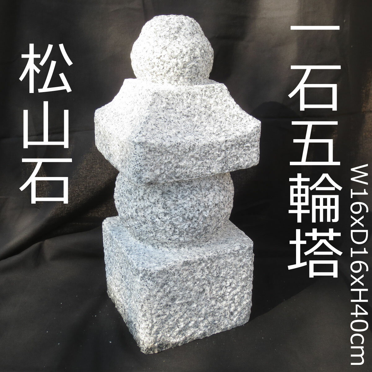 一つの石で削り出された「一石五輪塔」 小さい 五輪塔 和風 オブジェ 室内設置 墓仕舞い おはかじまいのあとの供養塔として 先祖供養 樹木葬 ペット墓として いかがでしょうか。 五輪塔は、平安中期から使われた墓石、供養塔です。5つの石が重なった形を持つのが特徴です。 品名:一石五輪塔 寸法:幅約16cm、奥行き約16cm、高さ約40cm 重量:約21kg 材質:中国産 松山石 (御影石) 加工:ノミギリ仕上げで石の風合いが優しく感じられます 御影石は、地下のマグマが地殻内の深いところで冷えて固まった結晶質の石材です。 硬く、風化に強く、重さもあり、他の石に比べて吸水率も低いという特徴があります。 耐久性に優れた「丈夫な石」の特徴を活かし、古くから道標や石の鳥居、石垣などに使われてきました。 今日でも墓石をはじめとし、建築物の外壁材や造園、舗道用石材など、構造物に最もよく用いられる、私たちにとって馴染みの深い石材です。 五大を象徴しているといわれていて、下から地・水・火・風・空と、古代インドにおける宇宙の構成要因を表しているといいます。 宝珠形(空) 半月形(風) 三角形(火) 円形(水) 方形(地) ---------------------------------------------------------------------------------------------------------------------------五輪塔は、下から方形=地輪(ちりん)、円形=水輪(すいりん)、三角形(または笠形、屋根形)=火輪(かりん)、半月形=風輪(ふうりん)、宝珠形または団形=空輪(くうりん)によって構成され、古代インドにおいて宇宙の構成要素・元素と考えられた五大を象徴する。これらは『大日経』などの経典に現れる密教の思想の影響が強い。それぞれの部位に下から「地(ア [a])、水(バ [va])、火(ラ [ra])、風(カ [ha])、空(キャ [kha])」の梵字による種子(しゅじ)を刻むことが多い。四方に種子を刻む場合は四転、例えば地輪に刻むアなら→アー→アン→アクという具合に刻む方角によって変化する。種子は密教の真言(密教的な呪文のようなもの)でもあるので下から読む。 宗派によって、天台宗・日蓮宗では上から「妙・法・蓮・華・経」の五字が、浄土宗では上から「南・無・阿弥・陀・仏」の文字が、禅宗では下から「地・水・火・風・空」の漢字五文字が刻まれる場合もあるが、宗派をとわず種子を彫ることも多い。日蓮正宗では必ず上から「妙・法・蓮・華・経」の五字を刻む。また、種子や文字のない五輪塔も多く存在する。 木製の板塔婆(板卒塔婆)も五輪塔の形態を持つ。これには表に下から「地(ア [a])、水(バ [va])、火(ラ [ra])、風(カ [ha])、空(キャ [kha])」の梵字による種子を、裏には仏教の智慧をあらわす金剛界の大日如来の種子鑁(バン [va])を梵字で書くことが多い。木製には他に角柱の卒塔婆もあり、真言や念仏がかかれることが多い。