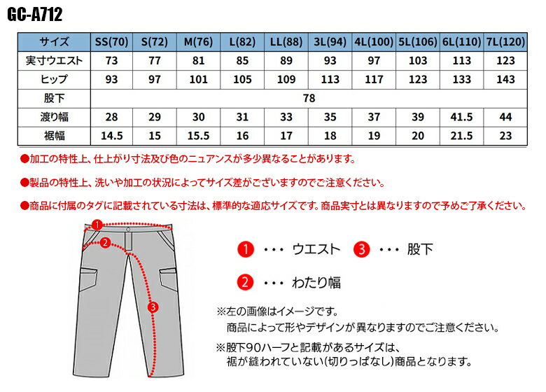デニムカーゴパンツ タカヤGC-A712の商品詳細 ストレスフリーな驚異の高伸縮ストレッチデニムを使用。 膝から裾にかけての強めのテーパードとほどよいゆったり感のウエスト。 ヒップとの絶妙なバランスのニューシルエット。 作業服の商品詳細 品 番 タカヤ GC-A712 シーズン 春夏・秋冬兼用(オールシーズン素材)素 材 8.5ozストレッチデニム 綿78%・ポリエステル20%・ポリウレタン2% カラー DB ディープブルー SP スペシャル RB リアルブラック BS ブラックスペシャル IS アイススペシャル その他 加工の特性上、仕上がり寸法及び色のニュアンスが多少異なることがあります。 ディープブルーとスペシャルのみSS・6L〜7Lの取り扱いがございます。 製品洗い ストレッチ 機能詳細一覧はこちら 作業服の色合いを上下セットで揃えたい場合は、同シリーズよりお選び頂くことをおすすめします。 ジャケット シャツ カーゴパンツ ジャケット カーゴパンツ ▼ 「サイズ×カラー」の項目が×になっている部分は現在売り切れ。メーカー在庫も欠品中です。