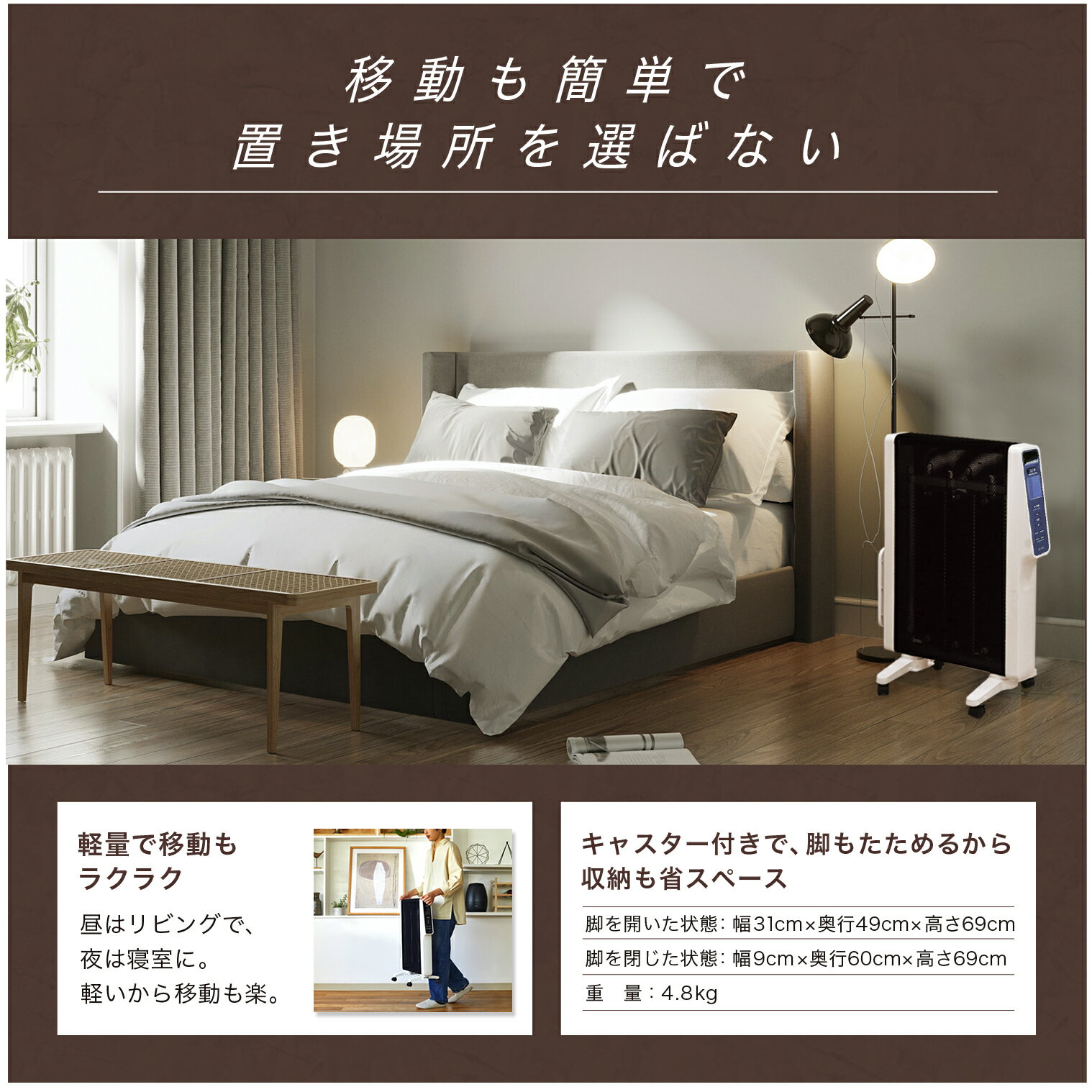 【商品紹介】 ■Wの熱効果で、すぐポカ 手足の冷えを効率的にあたためてくれる「遠赤外線」と、お部屋全体をあたためる「輻射熱」で冬の寝室を快適に。 ■風を起こさないから、空気キレイ 風を起こさないので床のホコリを巻き上げず、空気を汚しません。肌に直接風が当たり続けることもないので、乾燥も防ぎます。 ■軽いから、移動がラクラク 本体重量はわずか4.8kgと軽く、キャスターもついているので持ち運びラクラク。寝室からリビング、脱衣所など、どこでも移動して使えます。 ■場所を取らずに収納できる 脚が回転するのでスッキリ収納できる ■やけどしにくい 表面フロッキー加工で、当たってもやけどしにくい 商品名 遠赤軽量ヒーター かるポカ 型番 SN-M351(W) ホワイト SN-M351(K) ブラック メーカー(ブランド) シロカ siroca JANコード ホワイト:4589919828272 ブラック:4589919828289 電源電圧 50/60Hz 消費電力 1200W コード長 約2.3m サイズ 幅約31×奥行約49×高さ約69cm 重量 4.8kg 付属品 リモコン 機能 転倒OFF機能 チャイルドロック 過熱防止装置 タイマー設定機能 8時間自動停止機能 (タイマー設定時はタイマー優先) モード 温度モード/節電モード 出力モード 400/800/1200W(3段階) (マイカ板3枚構成(400W×3)) 保証期間 1年間 ご注文に関する注意事項 購入後のキャンセル、注文内容修正はできません。ご注文の際には、今一度氏名、住所、電話番号等ご確認の上、ご注文頂けますようお願い申し上げます。ご購入商品は、ご注文日より2週間以内にお支払いが完了いただけない場合、キャンセルとさせていただきます。 長期不在、住所不備、お受取拒否など、お客様都合によるキャンセルが発生した場合、別途送料実費をご請求させていただきます。 決済確認が取れるまで商品のお取り置きはできません。その間に在庫切れになる場合がございますので予めご了承ください。 商品が在庫切れになった場合、メールにてご連絡後、キャンセルのお手続きをさせていただきます。当店からの領収書発行を行う事はできかねます。予めご了承ください。お客様ご自身で購入履歴より領収書の発行が可能でございます。下記ヘルプをご確認の上、ご活用頂きますようお願い申し上げます。https://ichiba.faq.rakuten.net/detail/000006734 メーカー保証を受けるためには、「商品の保証書」と「発送完了メール」を保管頂く必要がございます。一部商品に関しては、保証書が付属しない場合がございます。販売期間は急遽変更になることがございます。予めご了承ください。 万が一商品不良があった場合には、誠に恐れ入りますが商品到着から1週間以内にお問い合わせ頂けますようお願い申し上げます。その期間を過ぎますとご対応できかねる場合がございます。予めご了承ください。 配送に関する注意事項 1回の注文につき1発送となります。他注文との同梱発送はできません。 1回の注文にて複数購入の場合、分割発送となることがございます。本日時点で、当店の管轄物流従業員における新型コロナウイルス感染の報告はございませんが、 感染者が発生した場合には、発送業務を一時的に停止もしくは縮小する可能性があり、 お届けまでにお時間をいただく場合がございます。予めご了承ください。 楽天DEAL ディール ポイント還元 ポイントバック