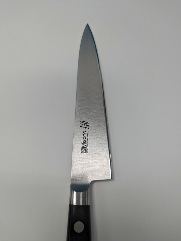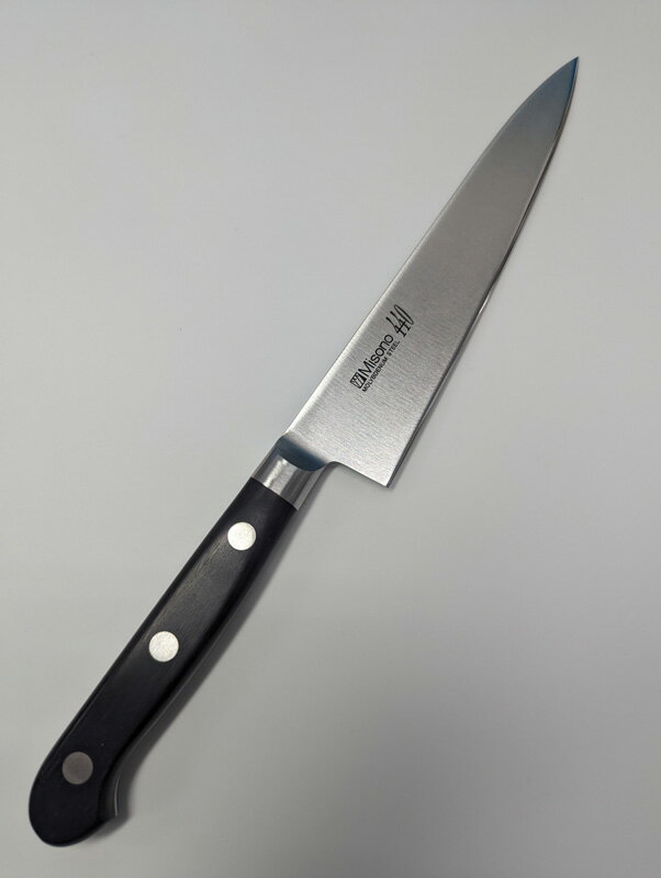 【商品紹介】 ■ミソノ刃物 ミソノは名刀関の孫六で有名な800年の伝統を誇る刀都関で、プロ用包丁を鍛え続けてきた専門メーカーです。伝統の技の上に新しい加工機械を駆使する先端技術を複合した加工方法を確立し、鋼やステンレス鋼を中心にした金属材料に鍛造、形つくり、熱処理、研削、研磨加工、刃付け加工に高度なテクノロジーを誇る調理刃物の一貫生産メーカーです。 ■特徴 一般によく使われている従来の13クロムステンレスより錆びにくく、より粘り強い16クロムステンレス鋼を使用。プロのフォルムとプロの切れ味のより錆びにくいしかも研げる高品質のプロ用包丁の秀作。 ■柄について 柄の素材は木の肌ざわりを感じさせてくれる強化木。水に強く変質しにくい特性をもちます。 [注意事項] ※冷凍ものをよく解凍せずに切りますと大きく刃欠けする原因になります。 ※包丁をお研ぎになる場合には、表裏とも砥石にベタに当てて研がないでください。 ※刃付けをする砥石の表面は長く使用しますと凹んできますので、2枚の砥石でこすり合わせるか、コンクリートの所でこするかして研ぐ面を平らにしてお使いください。 商品名 Misono ミソノ 440 ペティ 150mm No.833 型番 No.833 メーカー(ブランド) ミソノ Misono JANコード 4960316833012 原産国 日本 材質 刀身/16クロム・ハイステンレスモリブデン鋼 ハンドル部/積層強化木 楽天DEAL ディール ポイント還元 ポイントバック kitchenwarereview202312