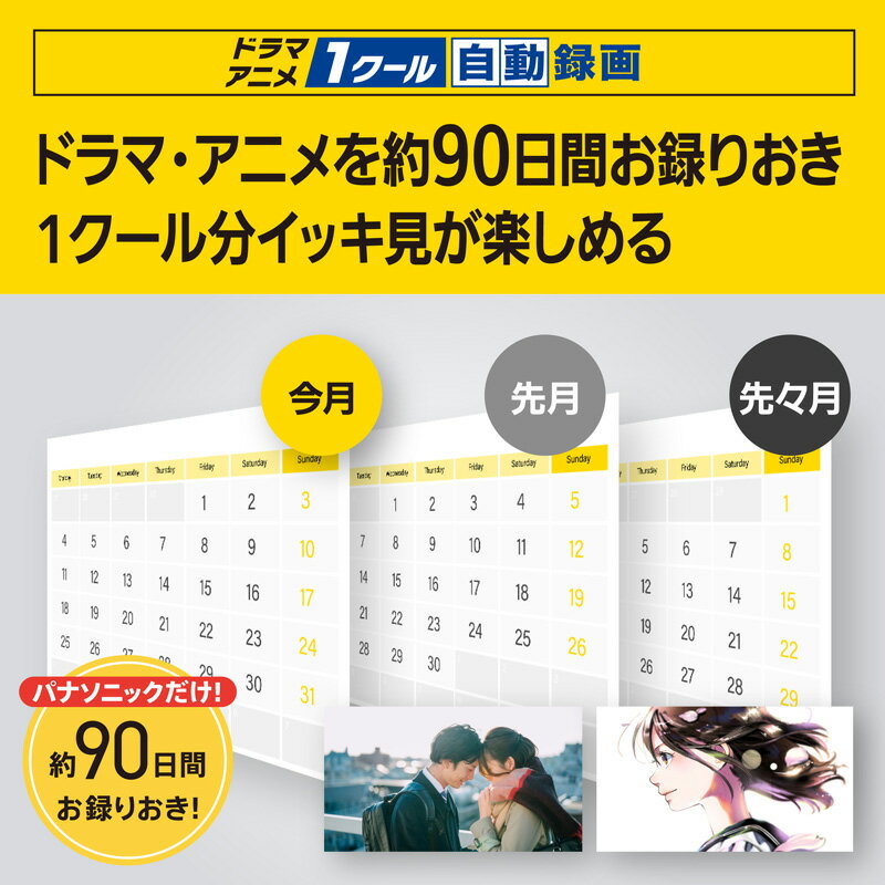 【商品紹介】 ■たくさんの「観たい」に応えてくれる 同じ時間帯に観たい番組が家族で重なる。 でも、リモコンの取り合いなんてしたくない。 4Kチューナー内蔵ディーガなら、最大3番組まで同時に録画*してくれるから、その時の観たいがちゃんと叶う。 4K放送の番組だって楽しめる。 ひとりひとりの観たいに応えられますように。 ■3番組同時録画で、観たいが重なっても諦めない。 3番組の同時録画に対応。 ハイビジョン放送 2番組と4K衛星放送 1番組など、組み合わせて録画することもできます。 また、「ドラマ・アニメ1クール自動録画」や「おまかせ録画」など、 たくさんの便利な録画機能を搭載しています。 ■美しい映像を、美しいまま。 パナソニック独自の圧縮技術「4K HEVCエンコーダー」搭載で、独自のアルゴリズムにより、美しさに不可欠な要素を判別。 動きの大きいスポーツなどの映像はノイズを低減し、風景などの動きの小さいシーンは精細感を保持。 長時間録画でも美しい映像を、美しいまま楽しめます。 ■スマホで、観たいがかなう。 「どこでもディーガ」アプリをインストール※1すれば、録画した番組や放送中の番組もスマホやタブレットで視聴可能。 4K衛星放送の番組をリアルタイムで視聴したり、番組をフルHD画質でスマホに持ち出して視聴したり、さまざまな楽しみ方が可能です。 商品名 Panasonic DIGA ブルーレイディスクレコーダー 4TB DMR-4T403 型番 DMR-4T403 メーカー(ブランド) Panasonic パナソニックマーケティングジャパン株式会社 DIGA ディーガ JANコード 4549980712573 HDD(ハードディスク内蔵) 4TB デジタルハイビジョン BS/CS4K放送方式、地上デジタル放送方式(日本)、衛星デジタル放送方式(日本) チューナー数 3(地上デジタル/BS/BS4K/CS/CS110度4K 共用×2_地上デジタル/BS/CS 共用×1) 予約プログラム数(予約可能表示) 128番組 (予約可能期間:1年間) 消費電力(約) 27W 年間消費電力量 24.6kWh/年 本体寸法(幅×高さ×奥行) 430mm×49mm×179mm(突起部含まず) 質量(約) 2.3kg 楽天DEAL ディール ポイント還元 ポイントバック