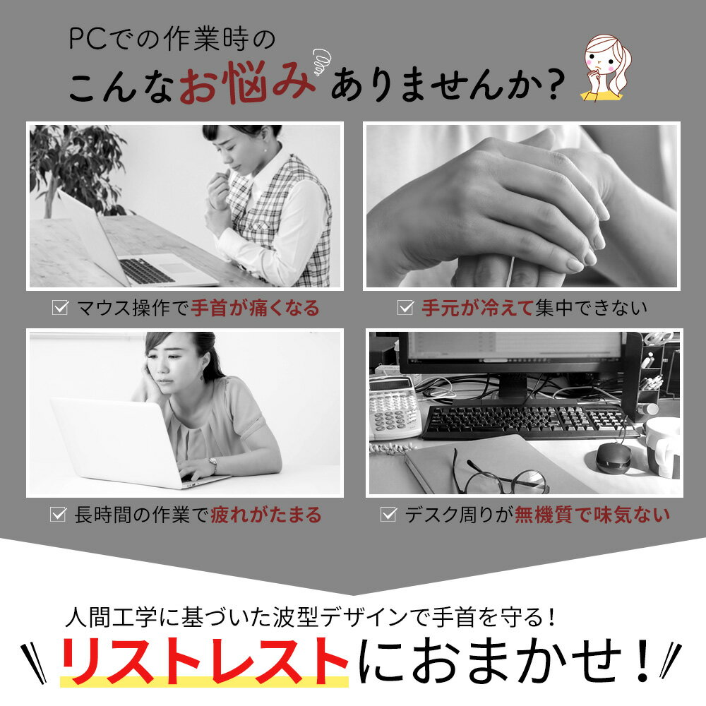 【スーパーSALEポイント10倍!】リストレスト かわいい おしゃれ シンプル アームレスト マウス パッド パソコン 手首 クッション リストレスト かわいい おしゃれ デザイン パソコン作業 疲れを軽減 ◎デスクに映える、かわいいかたち。「おこめ」「ふきだし」「ほね」ひらがなネームが愛らしい、癒しのフォルム。見た目のかわいさと、手首へのやさしさを両立したデザインです。◎手首に沿う形で疲れを軽減人間工学に基づいた波型デザイン&シリコン素材のほどよい弾力が手首のカーブに緩やかにフィット。事前な動きを支え、毎日の作業に安心と心地よさを添えます。◎もちもち、さらり、やさしい触感。手首のをふんわり包み込むシリコンジェル入り!表面の手触りはさらりと心地よく、長時間の使用でも快適さが続きます。◎水洗いOKでいつでも清潔!柔軟性と耐久性を兼ね備えた素材で水洗いもOK。毎日使うものだから、清潔に保てるのがうれしいポイントです。◎滑りにくい底面で、安定感◯底面は滑りにくい素材を使用しているからデスク上でズレにくい。作業に集中できる安心設計です。※底面の保護フィルムは剥がしてご使用ください。商品名:リストレストサイズ:おこめ 約14×8×1.8cm ふきだし 約12×9×1.8cm ほね 約14×8.7×2cm重量:おこめ 約130g ふきだし 約130g ほね 約140g素材:表面 無溶剤PUレザー / 充填素材 シリコンカラー:ホワイト / ブラック / グレー / ピンク / ブルー 5