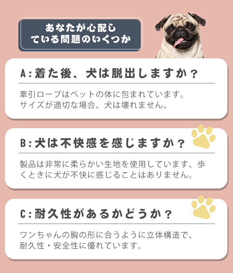 ■ 商品名 :ハーネス ■ ブランド:商標登録 §S∞U∞PERZEAL 登録第 6471760号 ▼ 商品名(検索キーワード)▼ 犬 ハーネス 胴輪 単品 名前 小型犬 中型犬 大型犬 柴犬 マジックテープ マジックテープ付き ベルクロ 夜間反射 痛くない 柔らかい やわらかく 通気性 快適 全犬種用 簡単装着 カスタムラベル サイズ調整可能 アジャストハーネス ハンドル付き ハンドル お出かけ お散歩 アウトドア 抜けない 引っ張り防止 脱げない 迷子防止 チェストストラップ ペットグッズ 犬具 引っ張り防止胴輪 訓練 柔らかい素材 抜けにくい 負担が少ない 散歩 夜 名入れ可 おしゃれ かわいい レディース メンズ キッズ ジュニア 男女兼用 女性 女性用 女子 女の子 男性 男性用 男子 男の子 彼女 彼氏 友人 大人 子供 家族 姉 兄 弟 妹 娘 嫁 妻 奥さん 旦那さん 母 父 お母さん お父さん 御母さん 御父さん 義母 義父 義理 ママ ぱぱ パパ ママ友 ペア お揃い 10代 20代 30代 40代 50代 60代 70代 80代 6歳 7歳 8歳 9歳 10歳 20歳 30歳 40歳 50歳 60歳 70歳 80歳 お返し お礼 ご挨拶 初売り お花見 入学式 新生活 文化祭 学園祭 お祝い 内祝い 結婚祝い 婚約祝い 入学祝い 卒業祝い 合格祝い 就職祝い 退職祝い 入園祝い 進学祝い 出産祝い 退院祝い 成人祝い ボーナス祝い 七五三祝い 還暦祝い 長寿祝い 優勝祝い 受賞祝い 当選祝い 引っ越し祝い 引越し祝い 引越祝い 新築祝い 栄転祝い 昇進祝い 誕生日祝い 餞別プレゼント お中元 お歳暮 お年賀 お正月 暑中見舞い 残暑見舞い 七夕 敬老の日 成人の日 成人式 父の日 母の日 結婚記念日 春物入荷 夏物入荷 秋物入荷 贈物 贈り物 誕生日 お誕生日 彼女にプレゼント こどもの日 プレゼント ギフト クリスマス ホワイトデー バレンタインデー バースデーITEM INFO 仕様 ・サイズ (約)▼ ・XXS:胴回り:33~42cm 首周り:28~34cm ハーネス重量:80g ・XS:胴回り:40~53cm 首周り:29~37cm ハーネス重量:95g ・S:胴回り:47~63cm 首周り:36~49cm ハーネス重量:114g ・M:胴回り:57~75cm 首周り:46~67cm ハーネス重量:206g ・L:胴回り:64~85cm 首周り:50~76cm ハーネス重量:261g ・XL:胴回り:73~99cm 首周り:57~85cm ハーネス重量:278g ・XXL:胴回り:86~119cm 首周り:61~90cm ハーネス重量:290g ※ ご注文の選択肢により、ご注文金額が変更される場合があります。 素材 ・ナイロン ・ステンレス カラー ・レッド ・ブラック ・オレンジ ・グリーン ・パープル ・ローズレッド ・ブルー ・カモフラオリーブ ・カモフラネイビー ・カモフラブルー ・カモフラレッド ブランド ◆ 商標登録 §S∞U∞PERZEAL 登録第 6471760号 特徴 ・大切なペットの首部の負担を減らすため、本ベスト式首輪はソフトな感触特殊的な設計で幅の増加により衝撃またはペットの窒息を防げます。 ・人間工学に基づいた三角形設計により活発なわんちゃんにも負担が少なく安心。 ・夜間反射テープ付きで、愛犬との夜の散歩でも安心できます。 ・ワンちゃんのサイズに合わせてベルトで調整可能、調整範囲は15~20cm ・ハーネスは背中のところにハンドルがついており、急に車が来たり、他の犬と出会ったりした際に素早く止めることができます。 ・愛犬のオリジナルマジックテープを作りましょう。お客様のお好きなワードを入れることが可能となります。 ご注意 ● 商品展示のリードは別売りです。 ● XXS、XSサイズのほうは、ハンドルを付ける空間が足りないため、ハンドルが付いておりません。予めご了承くださいます。 ● サイズ、容量は商品の特性上、多少の誤差が生じますのでご了承ください。 ● 商品の色は、モニターの発色具合により、実際の商品と異なって見える場合があります。 ● ご注文頂くタイミングによっては、ホームページ上で在庫がある商品も欠品になる場合がございます。 ● 入荷待ちの商品に関しましては、別途メールにてご連絡差し上げます。ご了承のうえご注文下さいます様お願い申し上げます。 ● 当店の商品は全て国内から配送されます。 ● 国内配送の商品は国内でのお買い物と同じく消費税が発生いたします。関税はかかりません。 製造国 中国製(日本の企画により厳格に生産されています。) ※重要※<オプション品ご購入の注意点> 楽天決済のシステム上、追加料金が自動加算されません。注文確定後に金額修正し、メールにてお知らせしますが、ご確認ください。