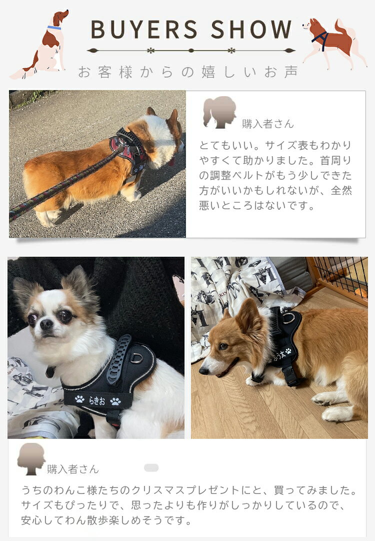 ■ 商品名 :ハーネス ■ ブランド:商標登録 §S∞U∞PERZEAL 登録第 6471760号 ▼ 商品名(検索キーワード)▼ 犬 ハーネス 胴輪 抜けない 単品 名前 名入れ可 カスタムラベル ハロウィン クリスマス シリーズ プリント 小型犬 中型犬 大型犬 柴犬 メッシュ ナイロン マジックテープ マジックテープ付き ベルクロ シリコン シリコン製 ハンドル付き ハンドル 夜間反射 痛くない 柔らかい やわらかく 通気性 快適 全犬種用 簡単装着 サイズ調整可能 アジャストハーネス お出かけ お散歩 アウトドア 引っ張り防止 脱げない 脱走防止 迷子防止 チェストストラップ ペットグッズ 犬具 引っ張り防止胴輪 訓練 柔らかい素材 抜けにくい 負担が少ない 散歩 夜 おしゃれ かわいい レディース メンズ キッズ ジュニア 男女兼用 女性 女性用 女子 女の子 男性 男性用 男子 男の子 彼女 彼氏 友人 大人 子供 家族 姉 兄 弟 妹 娘 嫁 妻 奥さん 旦那さん 母 父 お母さん お父さん 御母さん 御父さん 義母 義父 義理 ママ ぱぱ パパ ママ友 ペア お揃い 10代 20代 30代 40代 50代 60代 70代 80代 6歳 7歳 8歳 9歳 10歳 20歳 30歳 40歳 50歳 60歳 70歳 80歳 お返し お礼 ご挨拶 初売り お花見 入学式 新生活 文化祭 学園祭 お祝い 内祝い 結婚祝い 婚約祝い 入学祝い 卒業祝い 合格祝い 就職祝い 退職祝い 入園祝い 進学祝い 出産祝い 退院祝い 成人祝い ボーナス祝い 七五三祝い 還暦祝い 長寿祝い 優勝祝い 受賞祝い 当選祝い 引っ越し祝い 引越し祝い 引越祝い 新築祝い 栄転祝い 昇進祝い 誕生日祝い 餞別プレゼント お中元 お歳暮 お年賀 お正月 暑中見舞い 残暑見舞い 七夕 敬老の日 成人の日 成人式 父の日 母の日 結婚記念日 春物入荷 夏物入荷 秋物入荷 贈物 贈り物 誕生日 お誕生日 彼女にプレゼント こどもの日 プレゼント ギフト クリスマス ホワイトデー バレンタインデー バースデーペットグッズおすすめ ITEM INFO 仕様 ・サイズ (約)▼ ・XXXS:胴回り:27~33cm 首周り:27~32cm ハーネス重量:50g ・XXS:胴回り:37~47cm 首周り:28~36cm ハーネス重量:90g ・XS:胴回り:42~54cm 首周り:34~41cm ハーネス重量:130g ・S:胴回り:49~60cm 首周り:38~45cm ハーネス重量:193g ・M:胴回り:61~79cm 首周り:45~56cm ハーネス重量:294g ・L:胴回り:71~93cm 首周り:50~66cm ハーネス重量:380g ・XL:胴回り:81~112cm 首周り:63~87cm ハーネス重量:406g ・XXL:胴回り:88~121cm 首周り:77~95cm ハーネス重量:422g ※ ご注文の選択肢により、ご注文金額が変更される場合があります。 素材 ・ポリエステル ・ナイロン ・シリコン ・メッシュ カラー ・#01~#14 ブランド ◆ 商標登録 §S∞U∞PERZEAL 登録第 6471760号 特徴 ・大切なペットの首部の負担を減らすため、本ベスト式首輪はソフトな感触特殊的な設計で幅の増加により衝撃またはペットの窒息を防げます。 ・人間工学に基づいた三角形設計により活発なわんちゃんにも負担が少なく安心。 ・夜間反射テープ付きで、愛犬との夜の散歩でも安心できます。 ・ワンちゃんのサイズに合わせてベルトで調整可能、調整範囲は15~20cm ・ハーネスは背中のところにシリコン製ハンドルがついており、急に車が来たり、他の犬と出会ったりした際に素早く止めることができます。 ・愛犬のオリジナルマジックテープを作りましょう。お客様のお好きなワードを入れることが可能となります。 ご注意 ● 商品展示のリードは別売りです。 ● サイズ、容量は商品の特性上、多少の誤差が生じますのでご了承ください。 ● 商品の色は、モニターの発色具合により、実際の商品と異なって見える場合があります。 ● ご注文頂くタイミングによっては、ホームページ上で在庫がある商品も欠品になる場合がございます。 ● 入荷待ちの商品に関しましては、別途メールにてご連絡差し上げます。ご了承のうえご注文下さいます様お願い申し上げます。 ● 当店の商品は全て国内から配送されます。 ● 国内配送の商品は国内でのお買い物と同じく消費税が発生いたします。関税はかかりません。 製造国 中国製(日本の企画により厳格に生産されています。) ※重要※<オプション品ご購入の注意点> 楽天決済のシステム上、追加料金が自動加算されません。注文確定後に金額修正し、メールにてお知らせしますが、ご確認ください。