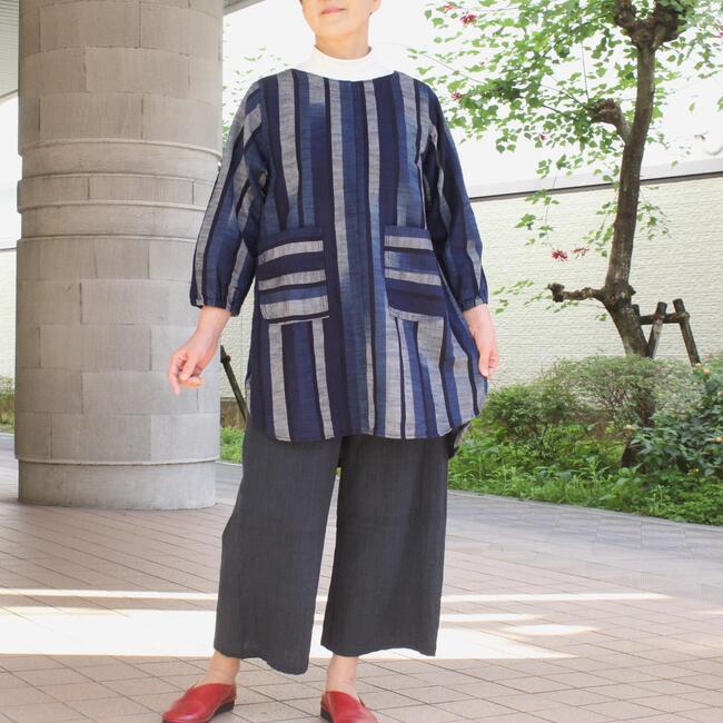 ギエモン 儀右ヱ門 久留米絣 割烹着 かっぽう着 チュニック 藍染 文人 藍 白樺マルチ レディース 人気 ミセス シニア ファッション 40代 50代 60代 70代 秋冬春 トップス ホームウェア エプロン スモック 大人 おしゃれ オカモト商店 ギフト包装無料