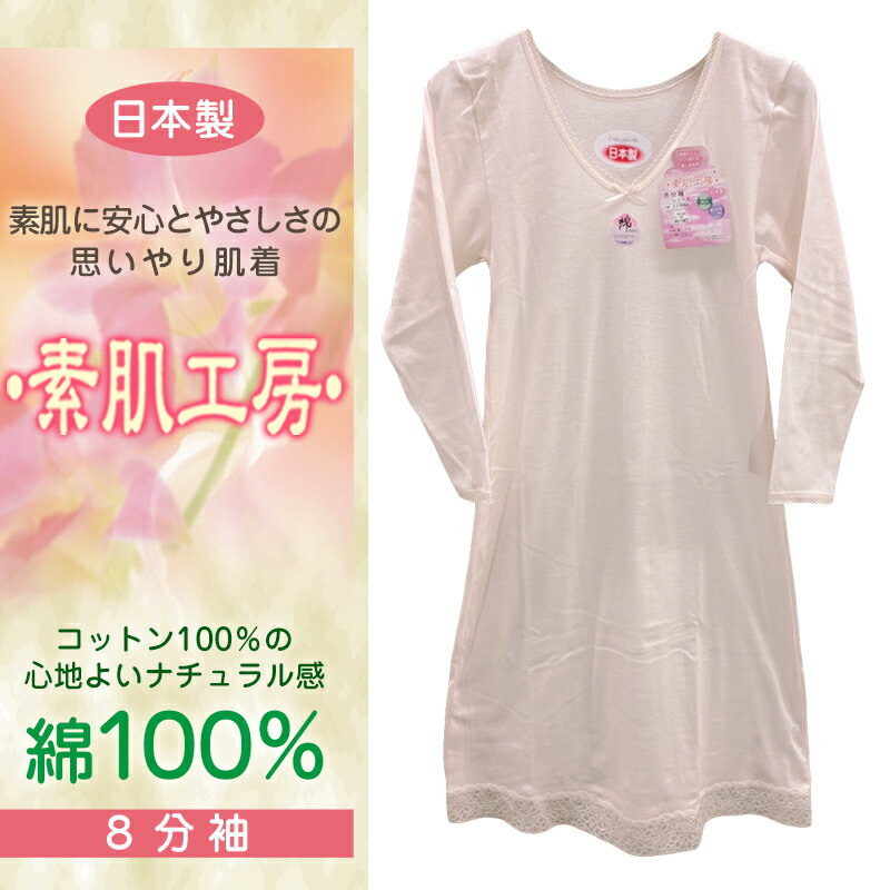 【要エントリー★3/25は抽選でポイントバック!】スリップ 長袖 綿100% 8分袖 シミーズ シュミーズ M〜LL インナー ワンピース ロング ひざ丈 ランジェリー 下着 肌着 レディース 透け防止 日本製