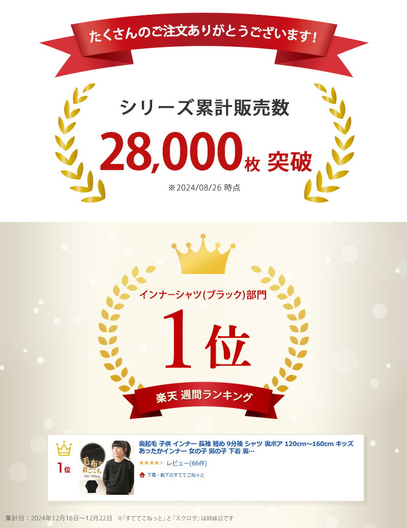 ショップトップ > カテゴリトップ > キッズ・ジュニア > 男の子 > 長袖シャツ◆Suteteko 子供 裏ボア 9分袖丸首シャツの紹介\シリーズ累計販売枚数 28,000枚 突破!/下着・靴下・ストッキングのネット通販《すててこねっと》のオリジナルブランド「Suteteko」裏ボア(裏起毛)インナーです!◆ポイント1:まるで毛布!ふわふわ裏ボア ( 裏シャギ— )内側の起毛が、一般的な裏起毛商品の毛足より少し長めなつくりになっているので、まるで素肌に直接毛布をまとっているような、ふわふわの肌触りを楽しめて暖かいです。おもて側はなめらかな質感で、布同士が引っ掛かりにくいので重ね着しやすいです♪毛布っぽいのに厚みは程よく、着ぶくれする心配もありません。◆ポイント2:ストレッチの効いた素材で動きやすいストレッチ性があるので締め付け過ぎず、体を動かした時にきつい感じがありません。ストレスのない心地よい使用感で、のびのびとした気分で過ごせます。フィット性も高く、よく体を動かすお子さまの動きにもしっかりフィットしてくれます♪◆こんなシーンにおすすめ!・寒い季節の通園・通学もあたたかい♪・卒業式など、寒い体育館での式典・イベントの寒さ対策に・スキー・スノーボード・スケートなどのウィンタースポーツのインナーに・雪遊びや初詣など、冬のおでかけに・ルームウェアとして使って暖房の光熱費の節約にも<ご注意>こちらの商品は、ボア素材の特性上、着用や洗濯により多少毛落ちが生じ、他の衣料に付着することがあります。最初の1、2回目の洗濯では他の衣料とは別に洗濯して下さい。【サイズ】120cm(着丈:49cm/肩幅:26cm/胸囲:60cm/袖丈:36cm/襟の深さ:7cm)130cm(着丈:52cm/肩幅:32cm/胸囲:64cm/袖丈:38cm/襟の深さ:8cm)140cm(着丈:55cm/肩幅:34cm/胸囲:68cm/袖丈:40cm/襟の深さ:8cm)150cm(着丈:58cm/肩幅:37cm/胸囲:74cm/袖丈:42cm/襟の深さ:9cm)160cm(着丈:61cm/肩幅:39cm/胸囲:78cm/袖丈:44cm/襟の深さ:9cm)【カラー】黒(ブラック)◆Suteteko 子供 裏ボア 9分袖丸首シャツの詳細商品名Suteteko 子供 裏ボア 9分袖丸首シャツ対象者子供(子ども・こども・キッズ・ジュニア)男女兼用(ユニセックス)ガールズ(女の子・女児・女子)ボーイズ(男の子・男児・男子)サイズ120cm(身丈:49cm/肩幅:26cm/胸囲:60cm/袖丈:36cm/襟の深さ:7cm)130cm(身丈:52cm/肩幅:32cm/胸囲:64cm/袖丈:38cm/襟の深さ:8cm)140cm(身丈:55cm/肩幅:34cm/胸囲:68cm/袖丈:40cm/襟の深さ:8cm)150cm(身丈:58cm/肩幅:37cm/胸囲:74cm/袖丈:42cm/襟の深さ:9cm)160cm(身丈:61cm/肩幅:39cm/胸囲:78cm/袖丈:44cm/襟の深さ:9cm)カラー黒(ブラック)素材・加工ポリエステル95%/ポリウレタン5%裏ボア ( 裏シャギー )生産国日本企画海外製関連キーワードSuteteko 厚手 /しまむらファンにおすすめ c-rec-aw23 k-b-ls k-g-ls scl-in STK101裏ボア 裏起毛 インナー 子供 下着 あったかいおすすめアイテムはこちら◆おすすめのカテゴリ \シリーズ累計販売枚数 28,000枚 突破!/下着・靴下・ストッキングのネット通販《すててこねっと》のオリジナルブランド「Suteteko」裏ボア(裏起毛)インナーです!◆ポイント1:まるで毛布!ふわふわ裏ボア ( 裏シャギ— )内側の起毛が、一般的な裏起毛商品の毛足より少し長めなつくりになっているので、まるで素肌に直接毛布をまとっているような、ふわふわの肌触りを楽しめて暖かいです。おもて側はなめらかな質感で、布同士が引っ掛かりにくいので重ね着しやすいです♪毛布っぽいのに厚みは程よく、着ぶくれする心配もありません。◆ポイント2:ストレッチの効いた素材で動きやすいストレッチ性があるので締め付け過ぎず、体を動かした時にきつい感じがありません。ストレスのない心地よい使用感で、のびのびとした気分で過ごせます。フィット性も高く、よく体を動かすお子さまの動きにもしっかりフィットしてくれます♪◆こんなシーンにおすすめ!・寒い季節の通園・通学もあたたかい♪・卒業式など、寒い体育館での式典・イベントの寒さ対策に・スキー・スノーボード・スケートなどのウィンタースポーツのインナーに・雪遊びや初詣など、冬のおでかけに・ルームウェアとして使って暖房の光熱費の節約にも<ご注意>こちらの商品は、ボア素材の特性上、着用や洗濯により多少毛落ちが生じ、他の衣料に付着することがあります。最初の1、2回目の洗濯では他の衣料とは別に洗濯して下さい。【サイズ】120cm(着丈:49cm/肩幅:26cm/胸囲:60cm/袖丈:36cm/襟の深さ:7cm)130cm(着丈:52cm/肩幅:32cm/胸囲:64cm/袖丈:38cm/襟の深さ:8cm)140cm(着丈:55cm/肩幅:34cm/胸囲:68cm/袖丈:40cm/襟の深さ:8cm)150cm(着丈:58cm/肩幅:37cm/胸囲:74cm/袖丈:42cm/襟の深さ:9cm)160cm(着丈:61cm/肩幅:39cm/胸囲:78cm/袖丈:44cm/襟の深さ:9cm)【カラー】黒(ブラック) よく一緒に購入されている商品798円798円998円798円類似商品はこちら798円798円798円798円848円1,490円848円798円